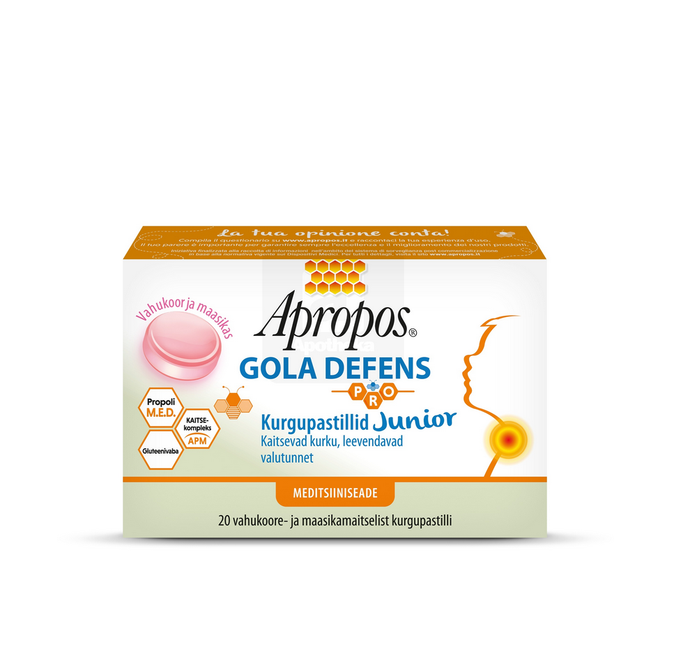 Dėl plėvelę formuojančio poveikio ir Propoli M.E.D.® įtraukimo Apropos Gola Defens Junior pastilės saugo gerklę nuo išorinių veiksnių, mažindamos skausmą, dažnai pasireiškiantį sergant faringitu ar tonzilitu. Grietinėlės ir braškių skonis daro Apropos Gola Defens Junior pastiles ypač tinkamas vaikams.