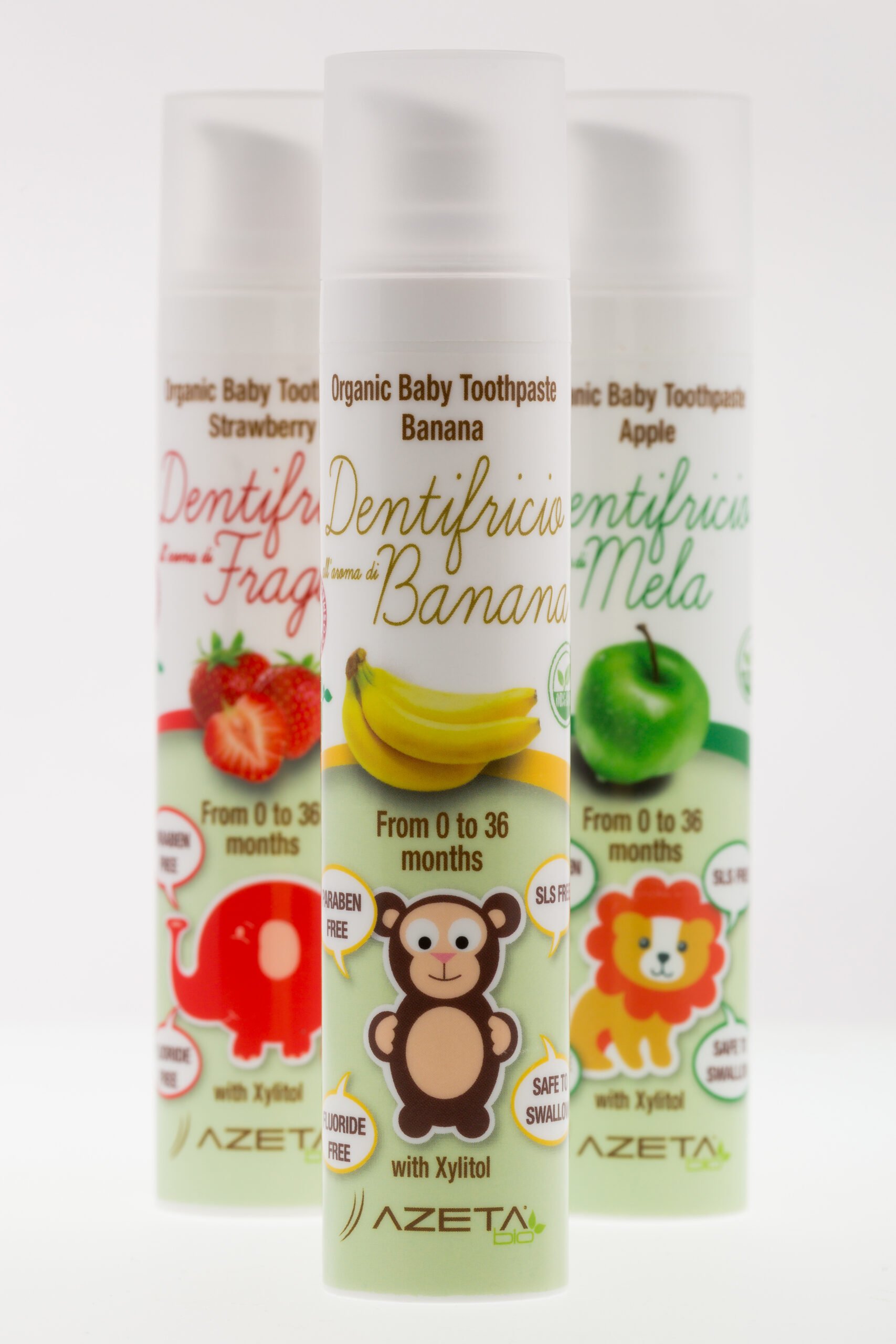 Azetabio ekologiškos dantų pastos švelniai veikia dantenas ir apsaugo dantų emalį nuo bakterijų. Dantų pasta turi malonų braškių skonį.