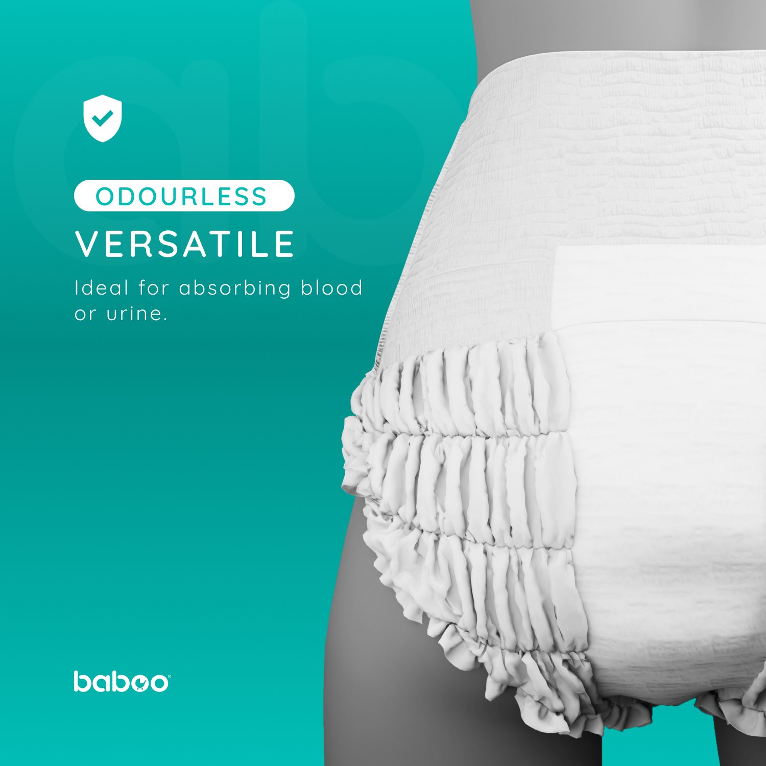 • Universalus veikimas: Nesvarbu, ar susiduriate su šlapimo nelaikymu, ar su gausiomis menstruacijomis – mūsų kelnės susitvarkys su užduotimi. Sugeriamoji pagalvėlė sukurta taip, kad efektyviai sulaikytų įvairius skysčius, įskaitant kraują ir šlapimą, todėl išliksite gaivūs ir sausi. Be to, baboo® kvapų blokavimo technologija panaikina nemalonius kvapus, suteikdama pasitikėjimo gyventi visavertį gyvenimą nepriklausomai nuo aplinkybių.