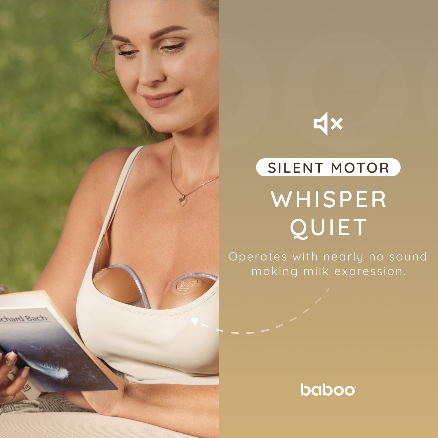 • Naudokite baboo® elektrinį laisvų rankų pientraukį tyliai ir diskretiškai dėl mūsų ypač tylaus pientraukio, kurio triukšmo lygis siekia vos 50 dB. Sukurtas tyliai veikti, jis puikiai tinka viešosiose vietose ar darbe, nesukeliant dėmesio.