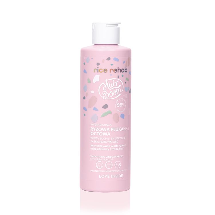 Šis ryžių acto skalavimo skystis sukurtas sausų ir pažeistų plaukų priežiūrai, tinkamas visų poringumų plaukams. Dėl natūralios sudėties su žemu pH jis glotnina plaukus, užveria kutikulą, sulygina plaukų struktūrą ir suteikia išskirtinio žvilgesio.