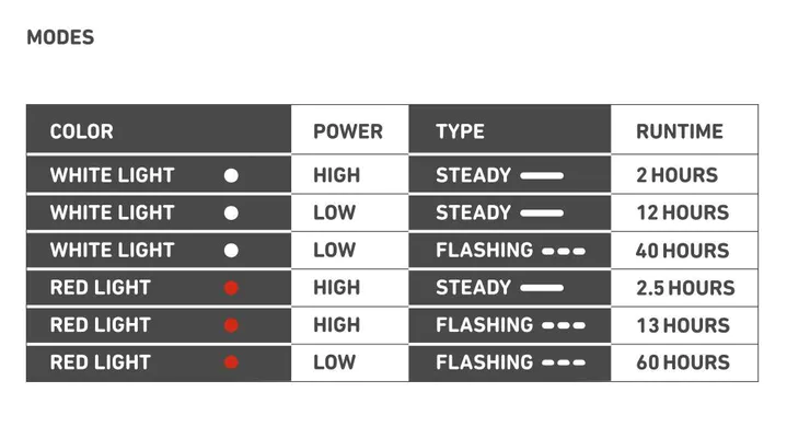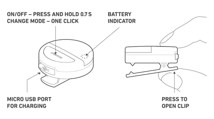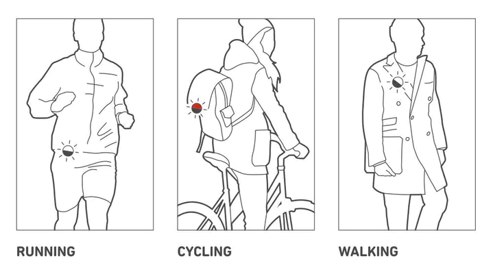 Lemputė turi įvairius veikimo režimus, kurie suteikia skirtingą švietimo trukmę (žr. nuotraukas). Atšvaitą galite pritvirtinti prie drabužių, rankinės ar bet kokios vietos, kur yra galimybė prisegti, vos vienu spragtelėjimu. Taip pat atšvaitą galima dėvėti įvairiose aktyviose veiklose, pavyzdžiui, bėgimo, važiavimo dviračiu, vaikščiojimo ir kt.