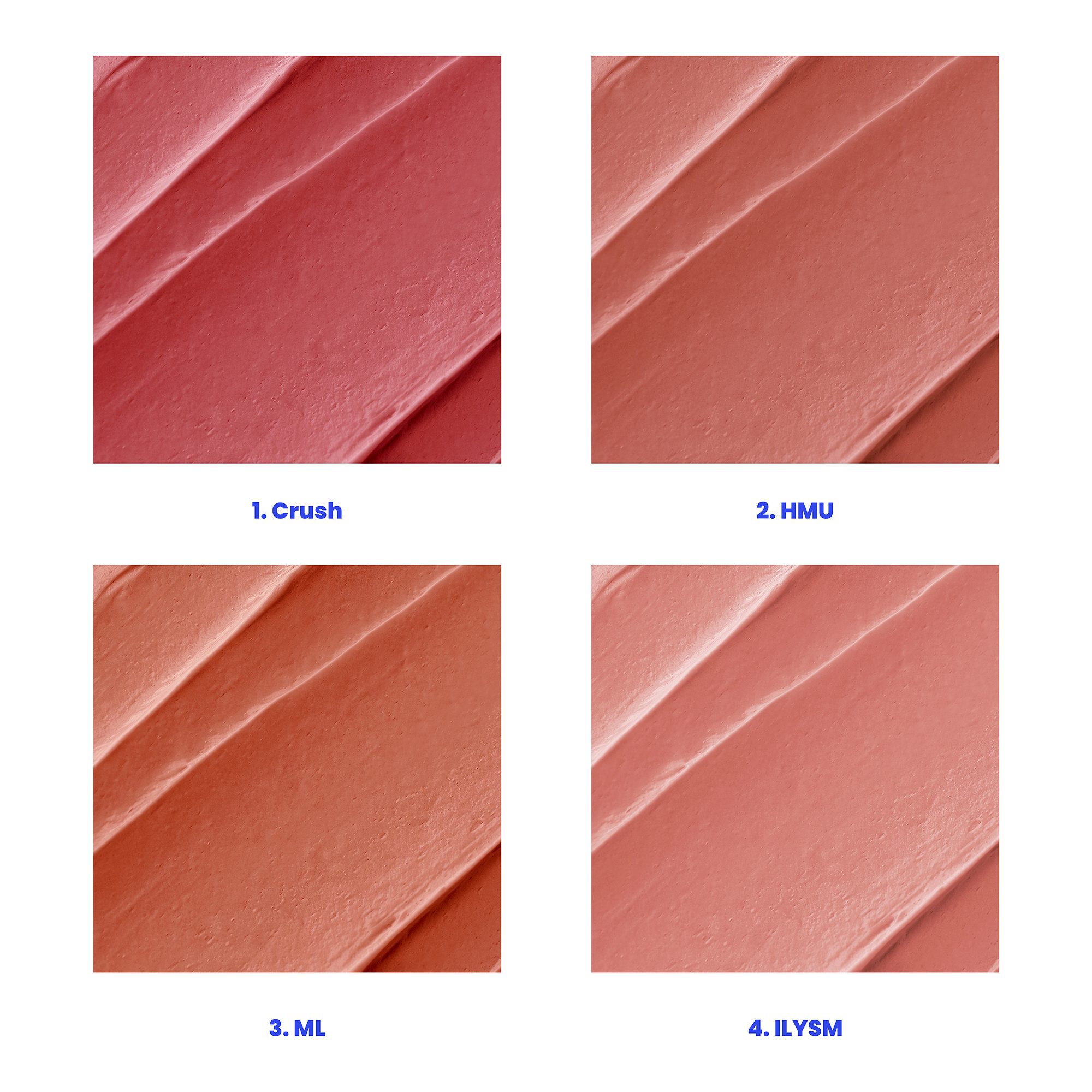 Kolekcijoje yra 4 kreminės tekstūros skaistalai, kurie lengvai susilieja su oda, užtikrinant tikslų padengimą.