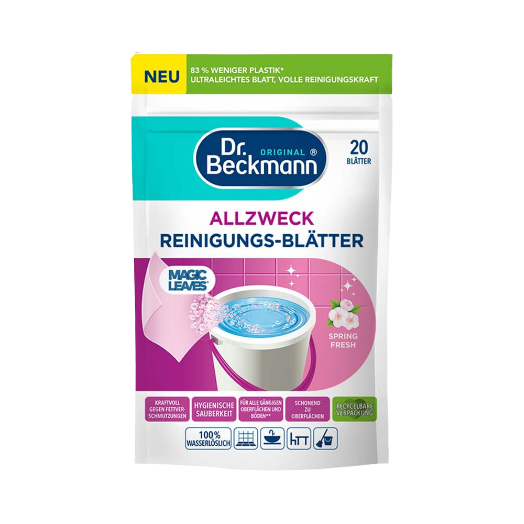 Universalūs vokiški valymo lapeliai Dr. Beckmann yra 100% vandenyje tirpūs. Dėl perdirbamos pakuotės jų sudėtyje yra 83% mažiau plastiko, lyginant su tradiciniais skystais universalais valikliais plastikiniuose buteliuose, esant lygiaverčiam pakuočių kiekiui. Efektyviam ir švelniam visų įprastų paviršių valymui.