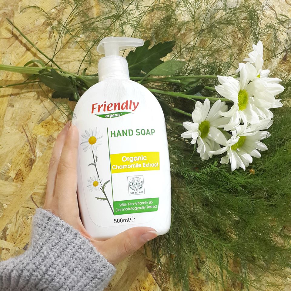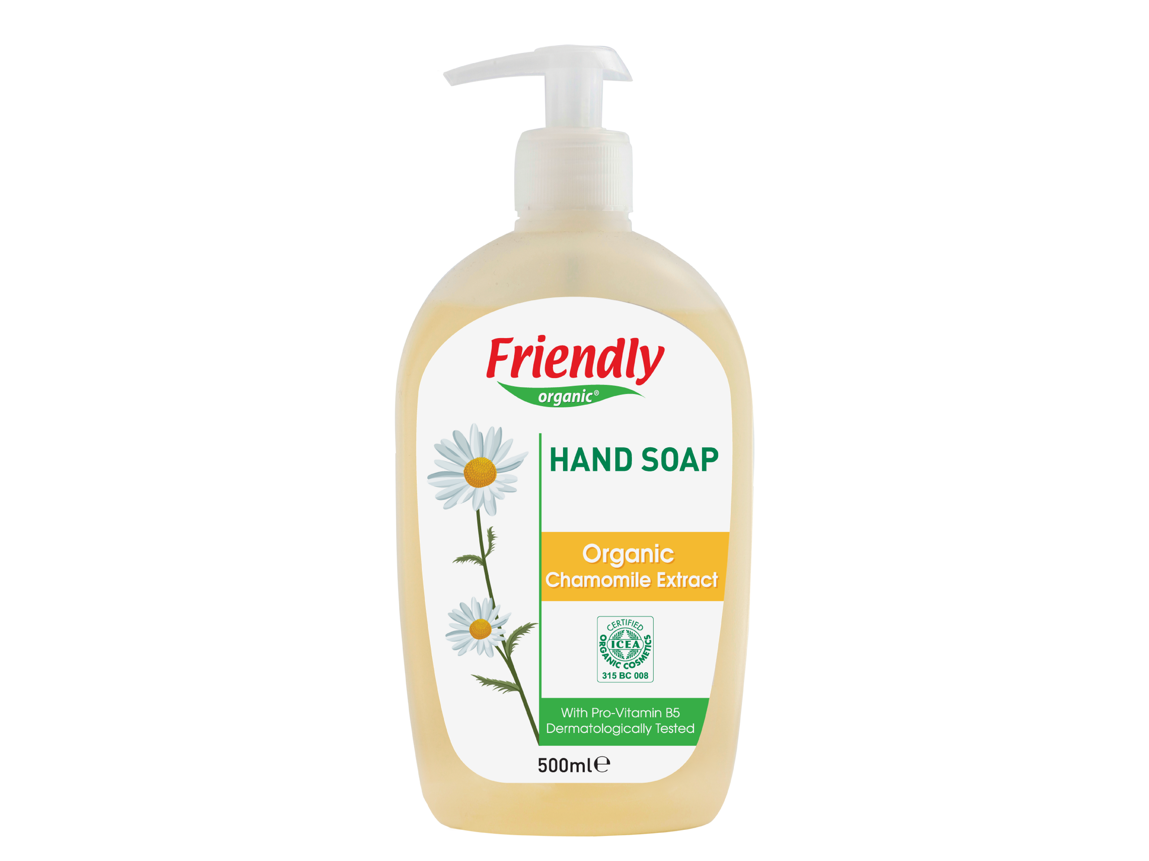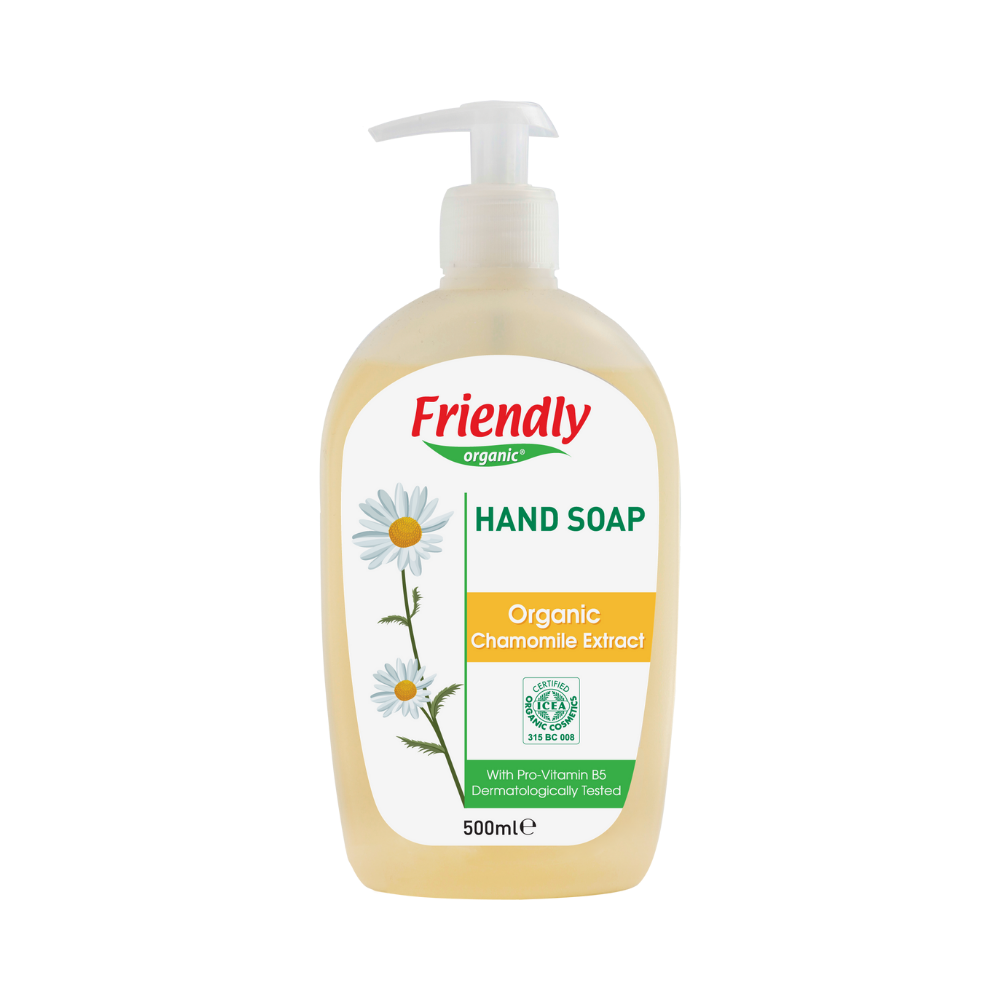 Friendly Organic skystas muilas su augalinės kilmės ingredientais švelniai valo jūsų rankas. Ramunėlių ekstraktas kartu su Provitamino B5 drėkina odą, paliekant ją minkštą ir su gaiviu kvapu. Muilas švelnus jūsų odai net ir dažnai plaunant, todėl yra idealus visai šeimai rankų plovimui.