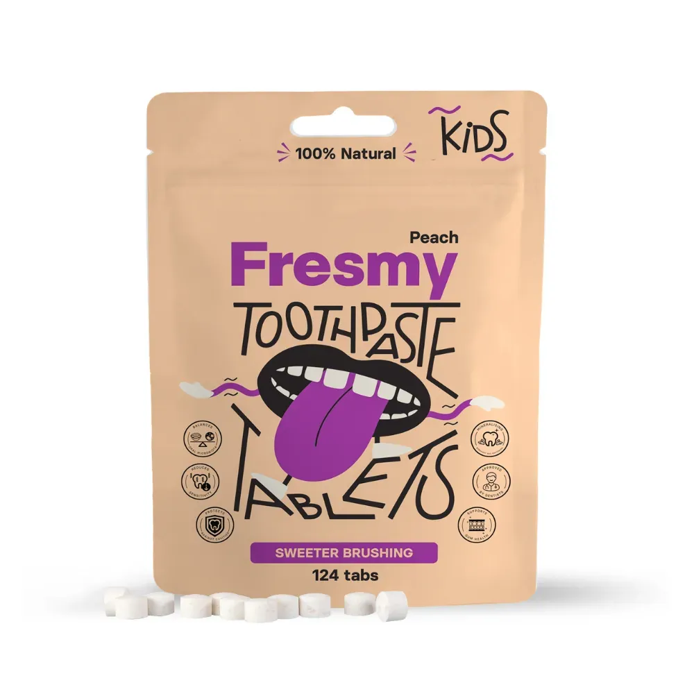 Natūralaus persikų skonio dantų pastos tabletės suteikia saldumo dantų valymui, teikiančios malonumą tiek vaikams, tiek jauniems širdimi. Švelnios, tačiau veiksmingos tabletės išsaugo sveikus dantis ir dantenas, kasdienę burnos higieną paversdamos linksmu ir vaisiniu potyriu, kurį nuoširdžiai mėgsta vaikai.