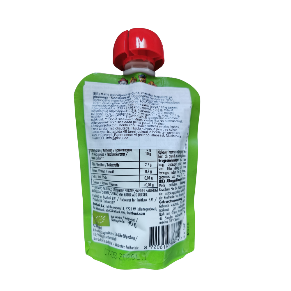 PEACH BITE: vaisiai 159 g* (koncentruota obuolių tyrė 73 g*, koncentruotos obuolių sultys 65 g*, koncentruota persikų tyrė 21 g*), citrusinių vaisių skaidulos, standiklis: vaisių pektinas, natūralus persikų aromatas su kitais natūraliais kvapais. *g panaudota 100 g galutinio produkto. Maistinė vertė 100 g: Energinė vertė: 1387 kJ/328 kcal, riebalai: 1,1 g, iš kurių sočiųjų riebalų rūgščių: 0,3 g, angliavandeniai: 73,5 g, iš kurių cukrų: 68,3 g*, skaidulos: 7,3 g, baltymai: 1,9 g, druska: 0,1 g. *Tik natūralus vaisių cukrus.