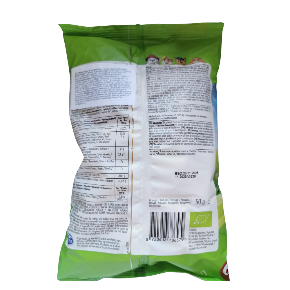 Sudėtis: datulių pasta, obuolių pasta (koncentruotos obuolių sultys, koncentruotas obuolių tyrė, tirštiklis: vaisių pektinas, antioksidantas: askorbo rūgštis), citrinų koncentratas, braškių milteliai 1 %, natūralūs kvapikliai. Maistinė vertė 100 g: Energinė vertė: 1253 kJ/298 kcal, riebalai: 0,5 g, iš kurių sočiųjų riebalų rūgščių: <0,1 g, angliavandeniai: 69 g, iš kurių cukrų: 63 g*, skaidulos: 6,9 g, baltymai: 1,8 g, druska: 0,1 g. *Tik natūralus cukrus iš vaisių. Alergenai: Gali būti javų, kuriuose yra glitimo, sojų, ir pieno, riešutų ir žemės riešutų pėdsakų. Gali būti vaisių kauliukų dalių.