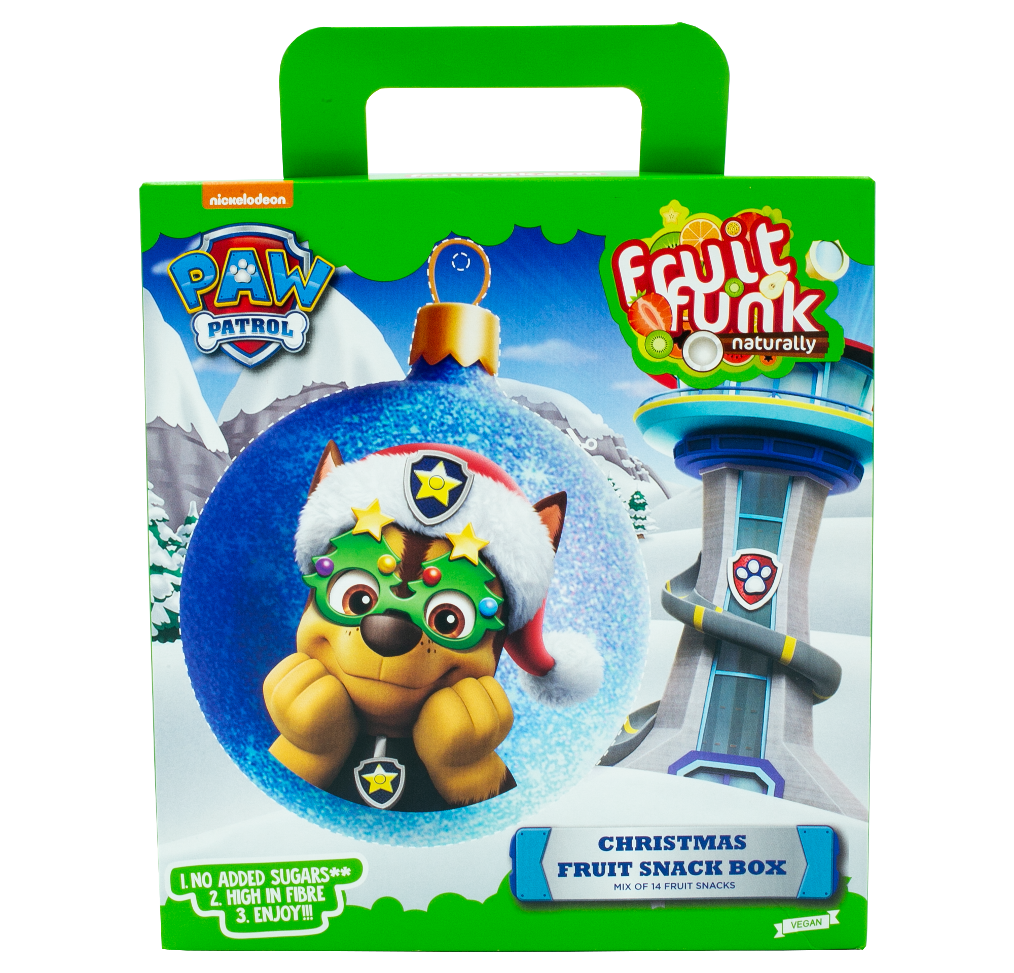Paw Patrol Kalėdinė dėžutė – puiki dovana šventėms. Dėžutėje yra 5 mini braškiniai batonėliai, 5 mini obuolių batonėliai ir 4 pakeliai braškių skonio vaisinių užkandžių.