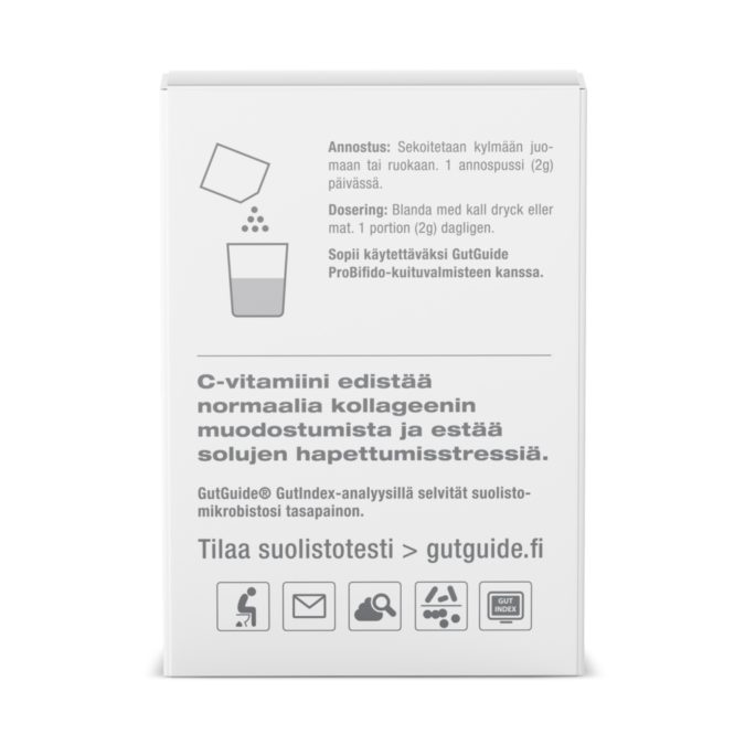 Vienos pakelio turinys (2 g): 2000 milijonų gyvų pieno rūgšties bakterijų (Bifidobacterium lactis BLC1, Lactobacillus rhamnosus LB21 CS, Lactobacillus rhamnosus SP1), 12 mg vitamino C, maltodekstrinas (iš kukurūzų)