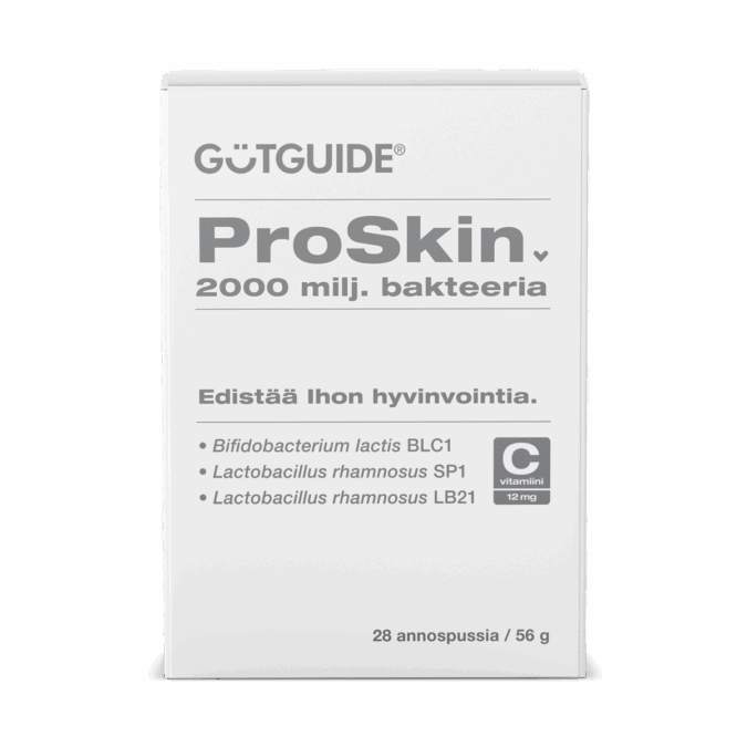 „GutGuide® ProSkin” yra inovatyvus maisto papildas, sujungiantis tris specialias pieno rūgšties bakterijų padermes ir vitaminą C, siekiant palaikyti jautrią odą per žarnyną. „ProSkin” sudėtyje yra tik liofilizuotos pieno rūgšties bakterijų milteliai ir iš kukurūzų gaunamas maltodekstrinas, kuris veikia kaip nešiklis. Produkte nėra dirbtinių kvapiklių ar skonio stipriklių bei kitų priedų.