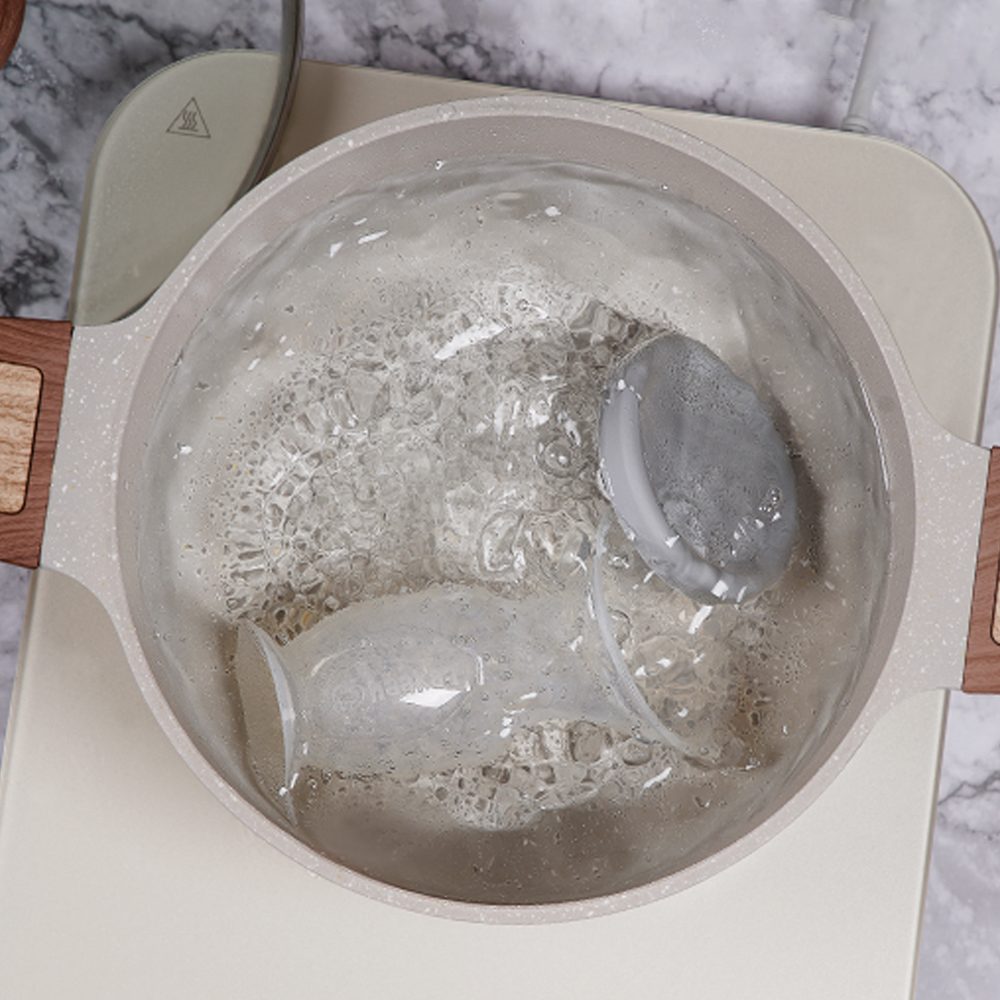 - Įdėkite pientraukį į verdantį karštą vandenį 2–3 minutėms. Nenaudokite baliklių turinčių valiklių ar valymo tablečių. UV pagrindo sterilizatorių naudojimas gali sutrumpinti pientraukio tarnavimo laiką. Pientraukį plaukite naudodami minkštas kempinėles ir šepetėlius.