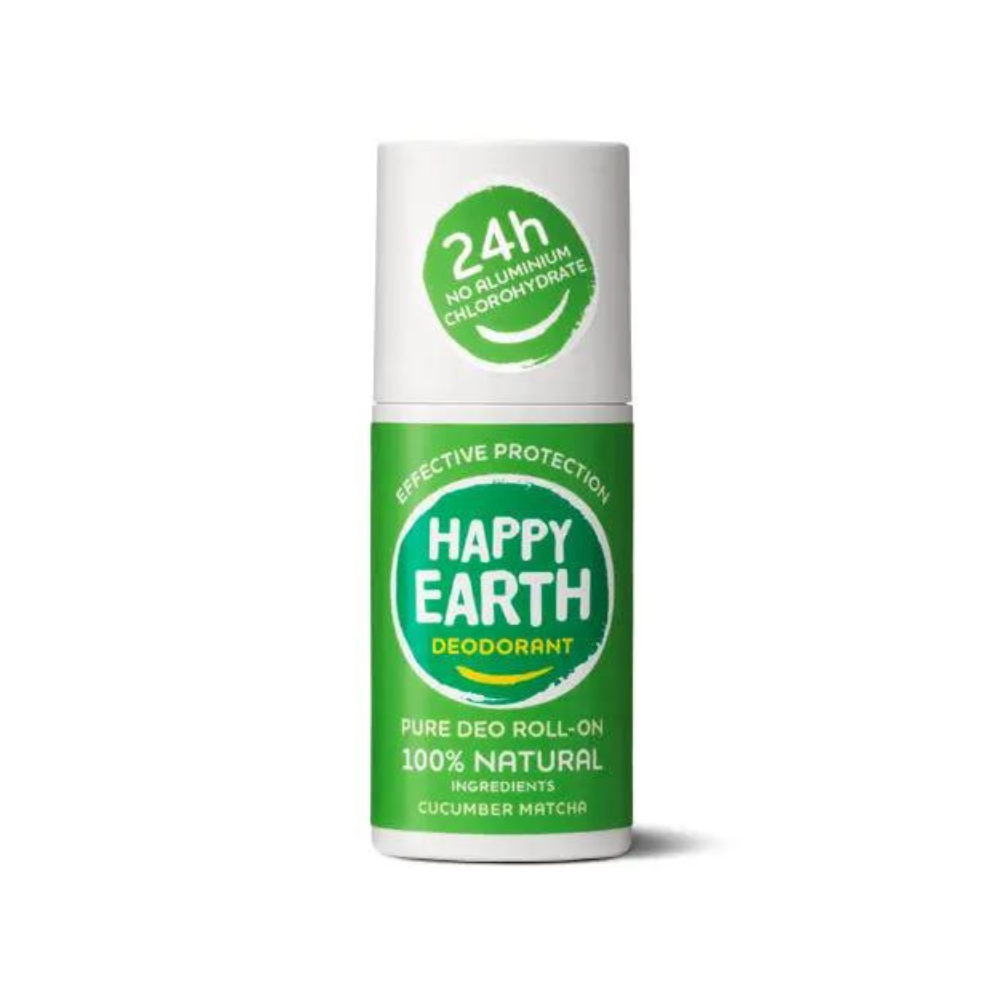 HAPPY EARTH DEODORANT yra 100% natūralus, 100% veiksmingas ir neturi nė vieno chemikalo. Gaivinantis agurko ir mačios kvapas, augaliniai ekstraktai, odą raminantis ekologiškas alavijas bei eteriniai aliejai. HAPPY EARTH DEODORANT naudojame tik tas sudedamąsias dalis, kurios džiugina jūsų odą. Kai tepate ką nors ant odos, gera žinoti, kad čia nėra teršiančių bei nemalonių ingredientų, tokių kaip chemikalai, alkoholis ar kiti kenksmingi priedai. Todėl išdidžiai turime NATRUE ir Vegan Society sertifikatus. O mūsų dezodorantų buteliukai pagaminti iš 100% perdirbto plastiko. Taigi rūpinatės ne tik savimi, bet ir mūsų planeta! Kad būtumėte laimingi: