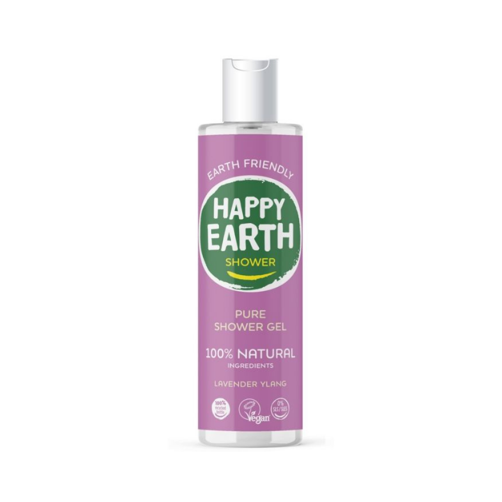 Happy Earth dušo gelis yra 100% natūralus, 100% efektyvus ir neturi jokių cheminių medžiagų. 100% natūralūs ingredientai – NATRUE sertifikatas. 100% perdirbto plastiko butelis. Veganiškas – Vegan Society sertifikatas.