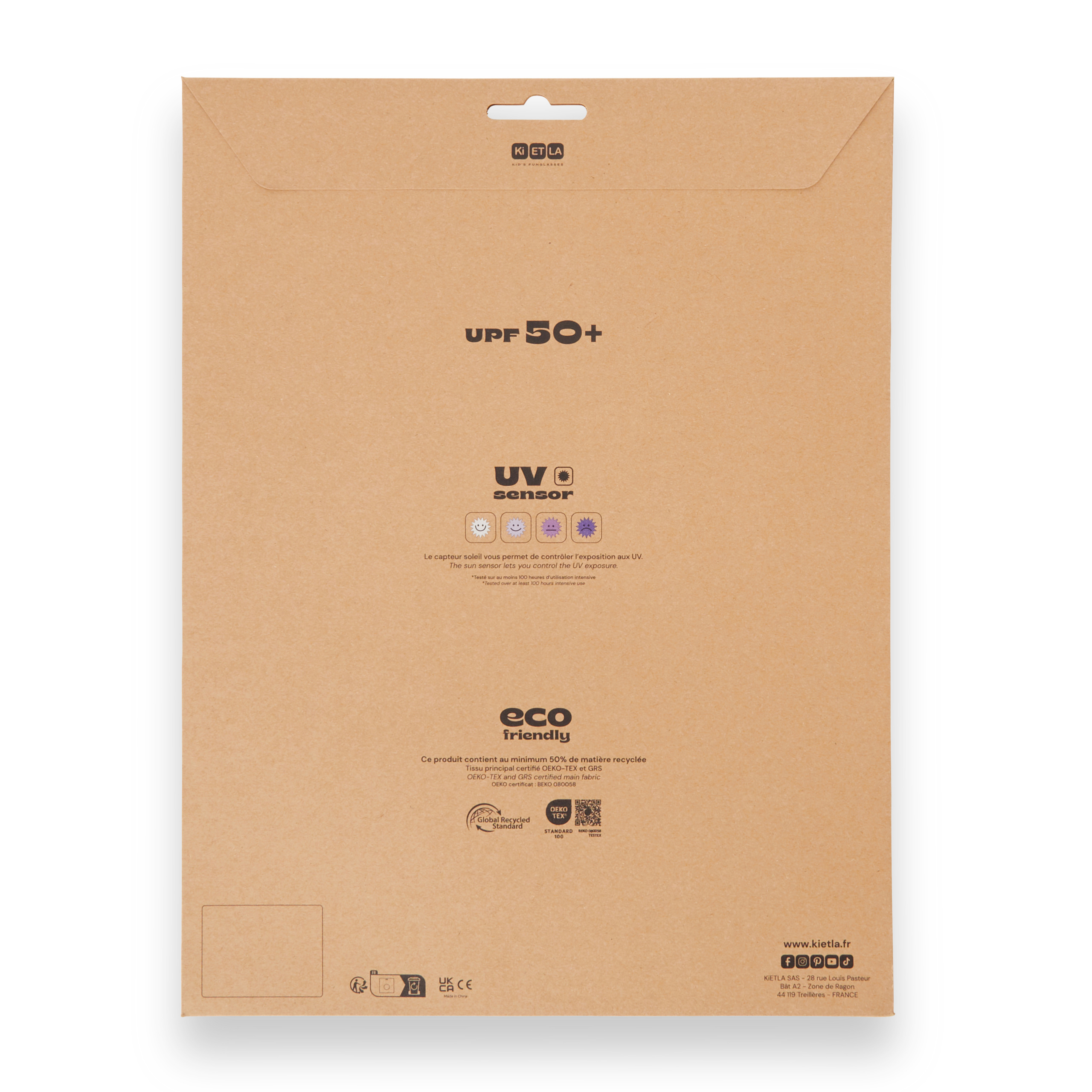 Visos maudymosi ir pončo serijos pakuotės yra įkvėptos Ki ET LA akinių stiliaus: natūralus kraft popierius su spalvingais akcentais. Modeliai, spalvos ir amžiaus ribos yra lengvai atpažįstami. Apvalus atidarymas apatiniame kairiajame kampe leidžia jusliškai pažinti medžiagą ir pamatyti spalvą.
