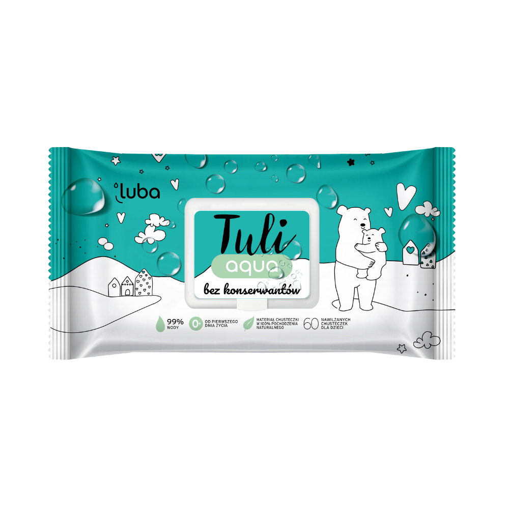 Leidžia naudoti Tuli Aqua švelnias drėgnas servetėles, kurios yra 99 % vandens pagrindu. Be konservantų, kvapiklių ir alkoholio. Sukurtos kūdikių odos priežiūrai, valymui ir gaivinimui nuo pat pirmosios gyvenimo dienos. Formulė pagrįsta pakartotinai filtruotu vandeniu.