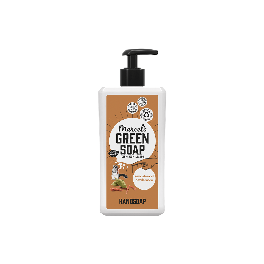Marcel Green Soap produktai supakuoti į 100% perdirbtą pakuotę.