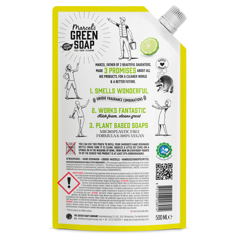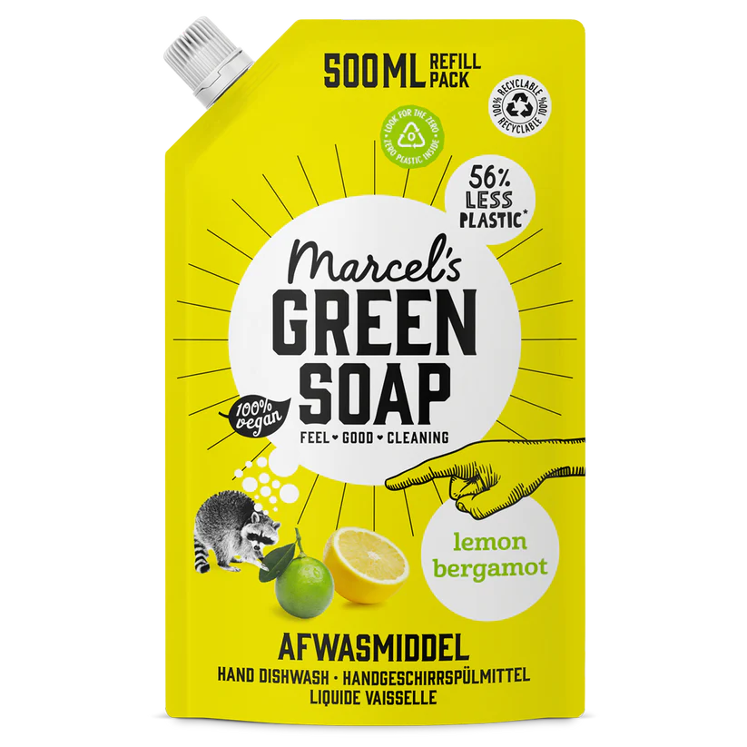 Praktiška 500 ml papildymo pakuotė sutaupo 56% plastiko, palyginti su nauju buteliu. Butelis pagamintas iš 100% perdirbto plastiko ir yra papildomas. Sudėtis be mikroplastiko ir bent 97,5% biologiškai skaidoma pagal OECD gaires – gera tiek jūsų indams, tiek planetai.