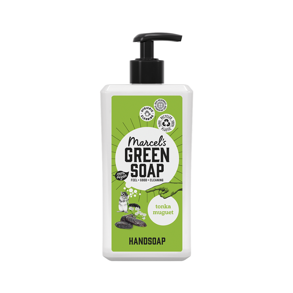 Marcel Green Soap produktai supakuoti į 100% perdirbtą pakuotę.