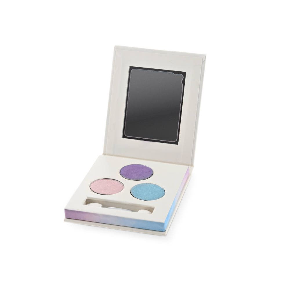 Paletė su dvigubu aplikatoriumi, veidrodėliu ir 3 spindinčiais perliniu atspalviu akių šešėliais.