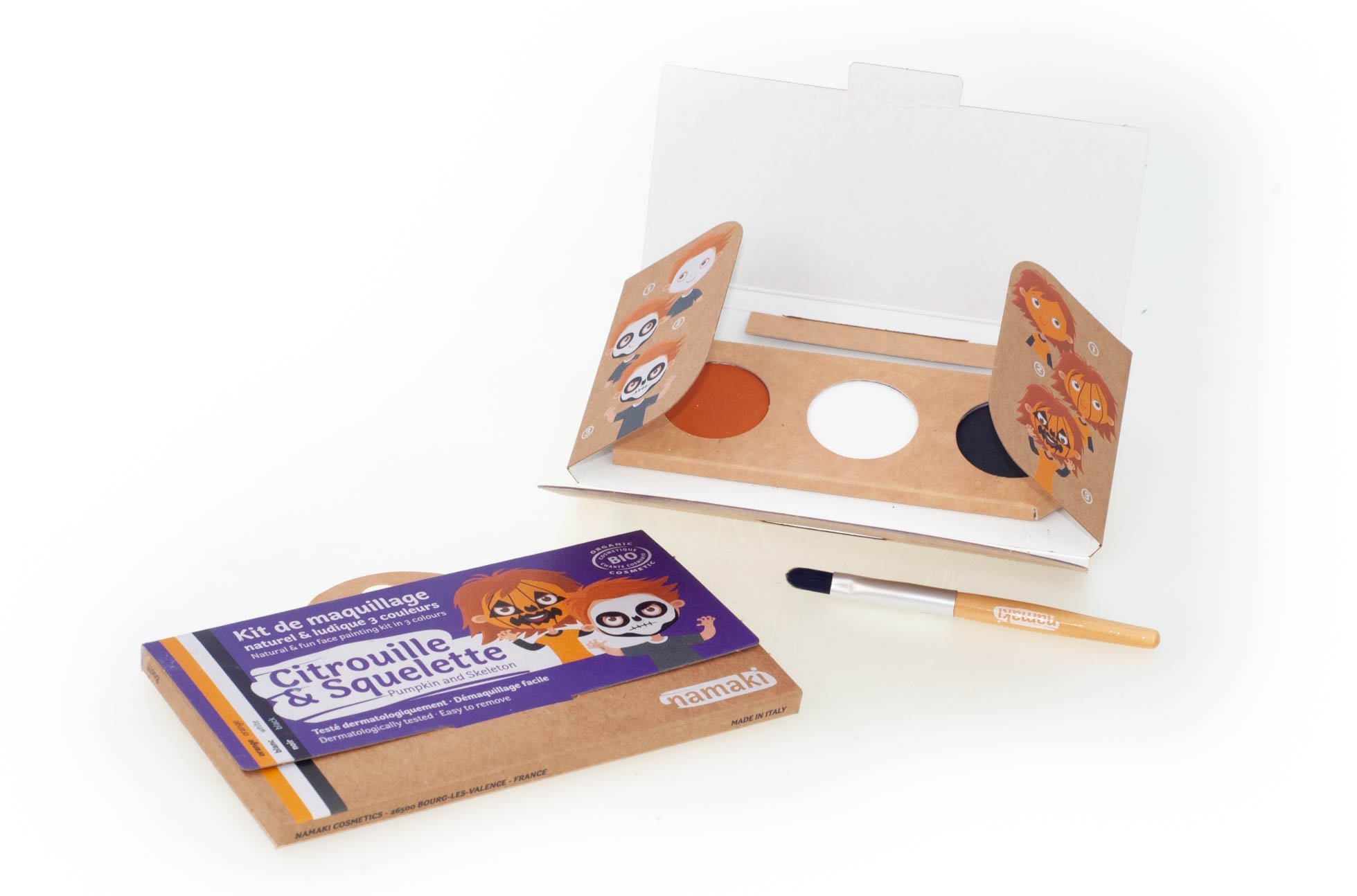 Naudodamiesi trijų spalvų rinkiniu ir pridedamomis instrukcijomis galite nusipiešti ant veido tiek moliūgą, tiek skeletą.