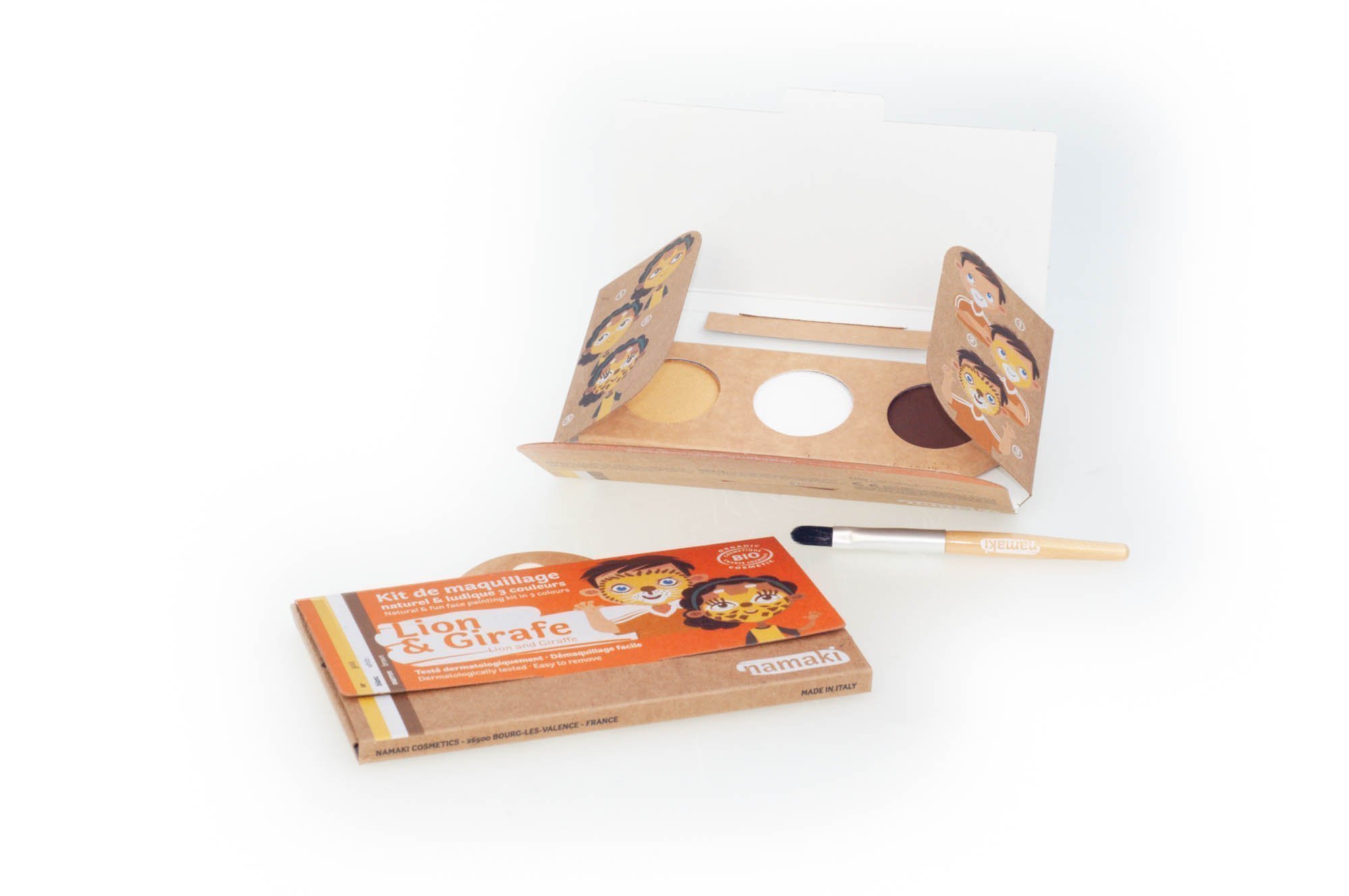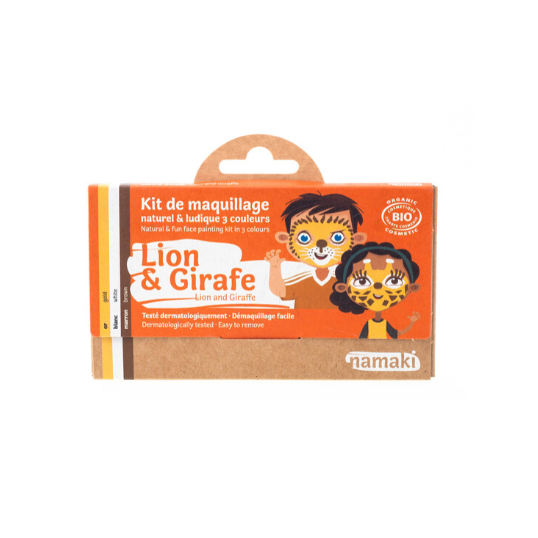 Su trijų spalvų rinkiniu galite nupiešti žirafą ir liūtą ant savo veido, naudodamiesi pridėtu vadovu.