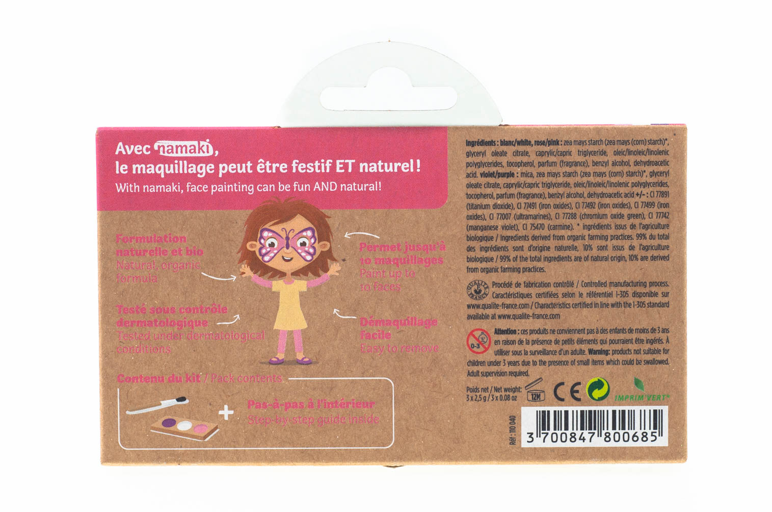 Spalvose nėra įprastai veido dažams naudojamų cheminių medžiagų. Visos spalvos yra hipoalerginės ir vandens pagrindo, pagamintos iš natūralių augalinių ingredientų arba mineralinių pigmentų.
