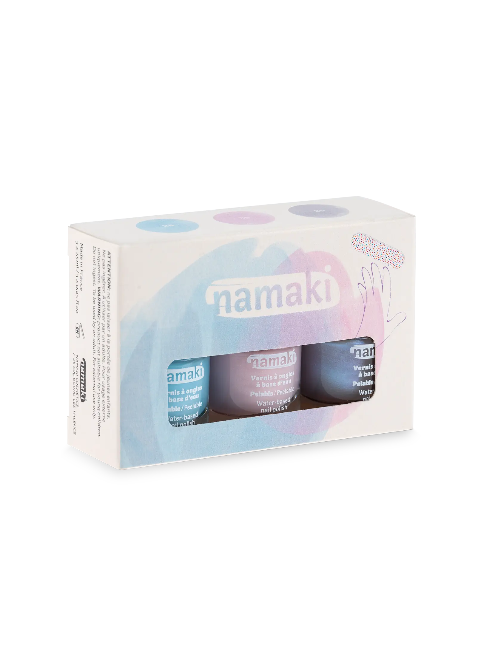 Vandens pagrindo nagų lakas, sukurtas specialiai vaikams, kurį galima nuimti lyg lipduką. Namaki sukūrė draugišką aplinkai, lengvai nuimamą vandens pagrindo nagų laką, kuris neturi tirpiklių ar kvapiųjų medžiagų, todėl vaikai gali žaisti nerizikuodami savo ir planetos sveikata. Šiame nuostabiame rinkinyje yra populiariausios kolekcijos spalvos, leidžiančios vaikams nusidažyti nagus pagal žaidimus, pomėgius ar aprangą: Frosty Blue, Pale Pink ir Silver Blue.