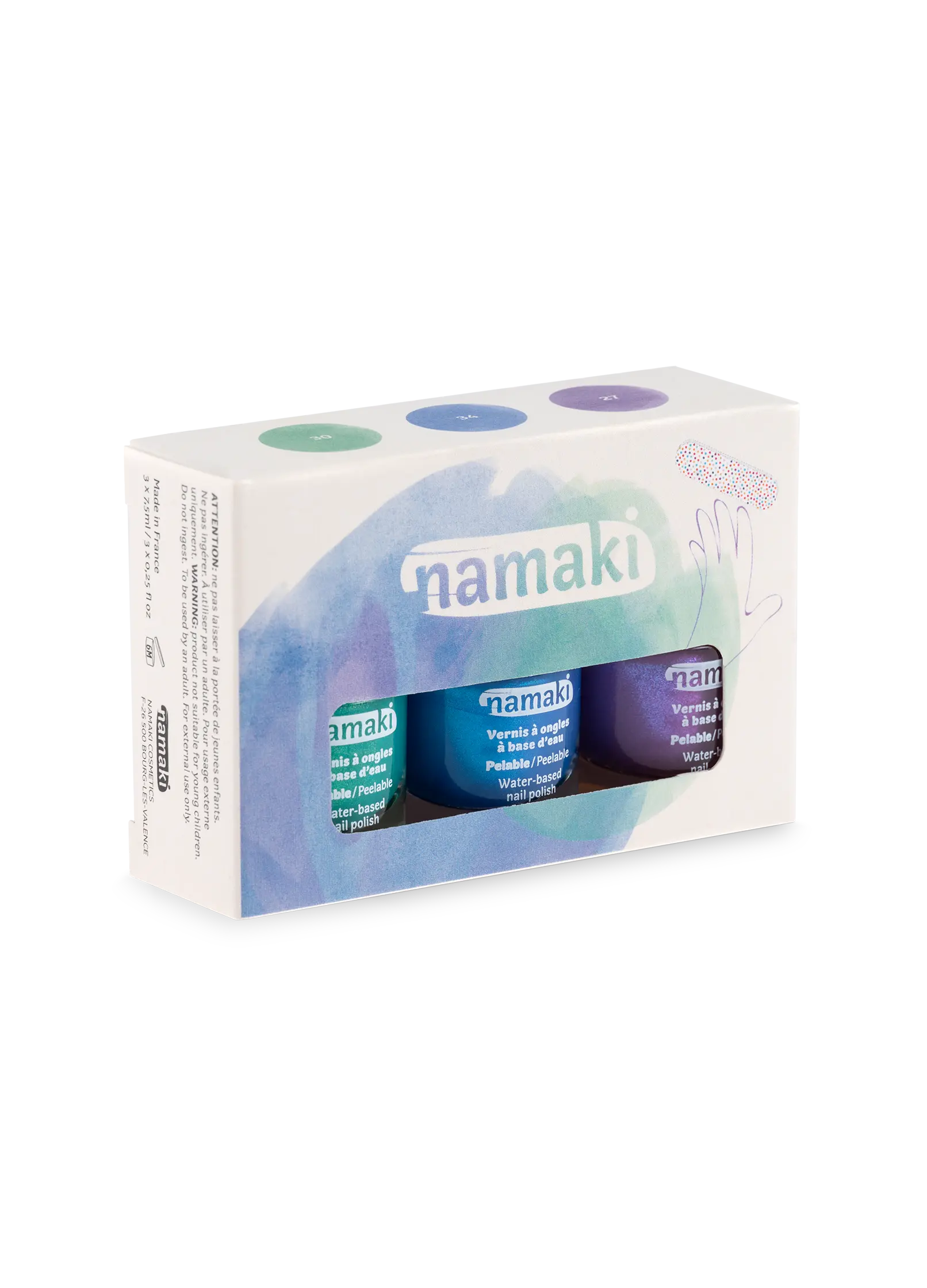 Vandens pagrindu pagamintas nagų lakas, specialiai sukurtas vaikams, kurį galima nuplėšti kaip lipduką. Namaki sukūrė draugišką aplinkai, nuplėšiamą vandens pagrindo nagų laką be tirpiklių ir kvapiųjų medžiagų, todėl vaikai gali žaisti nekenkdami nei savo, nei planetos sveikatai. Šis žavingas rinkinys apima populiariausias kolekcijos spalvas ir leidžia vaikams lakuoti nagus pagal savo žaidimus, pomėgius ir aprangą: Caribbean, Electric-Glitter Violet.