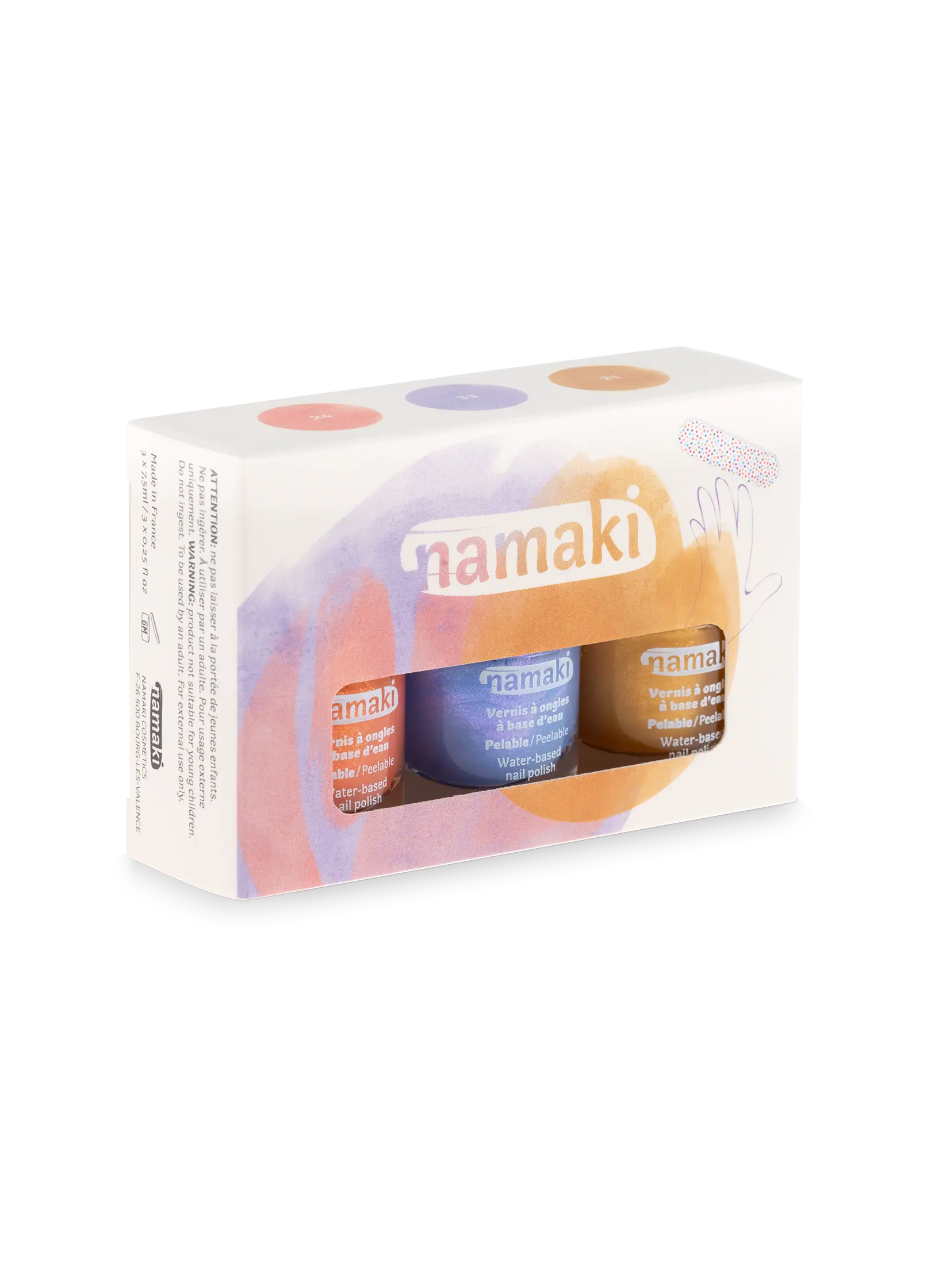 Vandens pagrindu pagamintas nagų lakas, specialiai sukurtas vaikams, kurį galima lengvai nulupti kaip lipduką. „Namaki“ sukūrė draugišką aplinkai, nulupamą vandens pagrindo nagų laką, kuriame nėra tirpiklių ar kvapų, todėl vaikai gali žaisti nerizikuodami savo ar planetos sveikata. Ši nuostabi rinktinė apima populiariausias spalvas, tad vaikai gali lakuoti nagus derindami prie žaidimų, pomėgių ar aprangos: Koralinė, Levandų mėlyna, Auksinė.