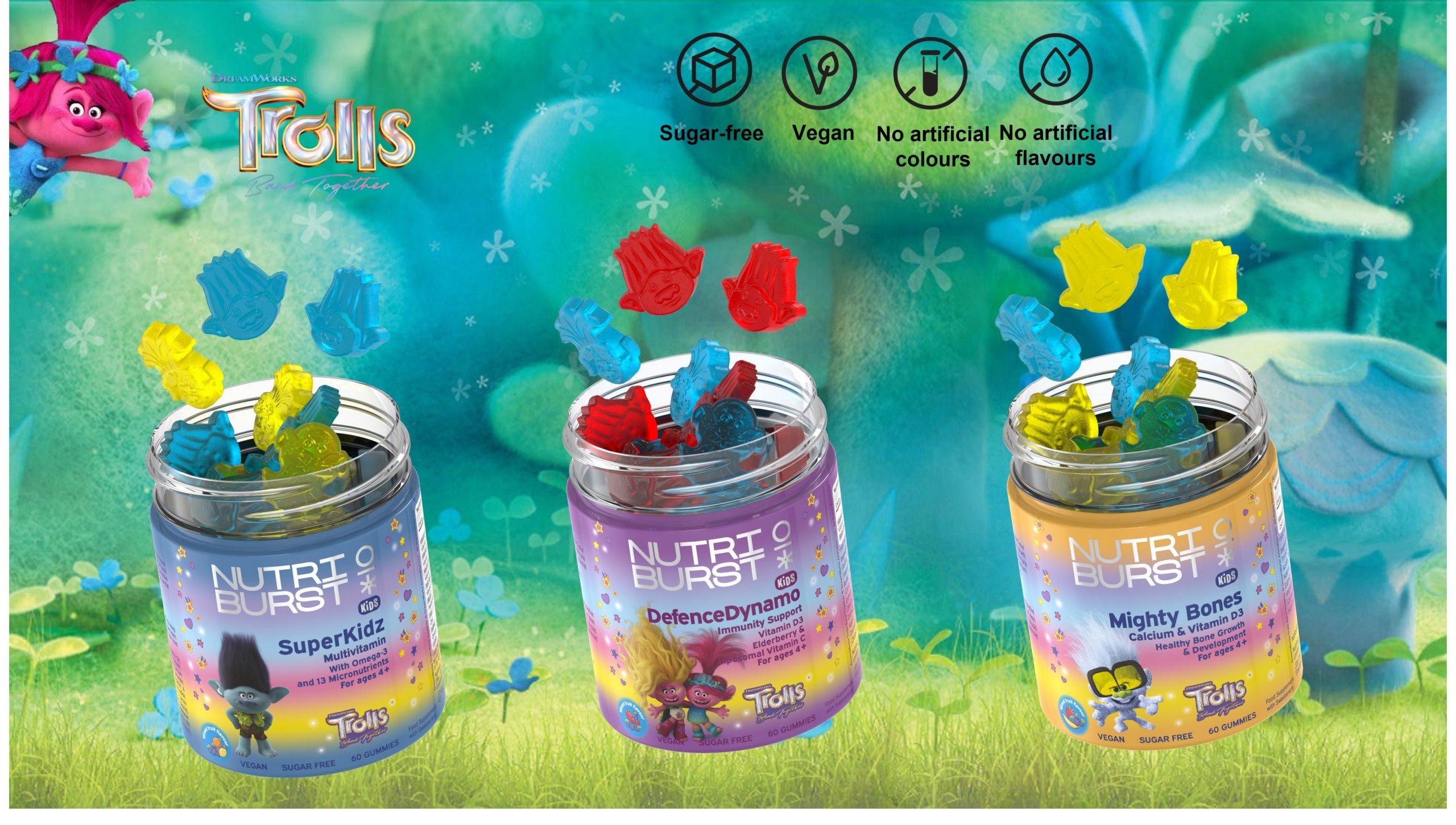 Maisto papildas su saldikliais, vaisių mišinio skoniu, veganiškas, be cukraus, be glitimo, be riešutų, be kiaušinių, be pieno, ir be sojos. Sudėtyje nėra dirbtinių dažiklių ir kvapiųjų medžiagų. Stiklainis turi 60 guminukų.