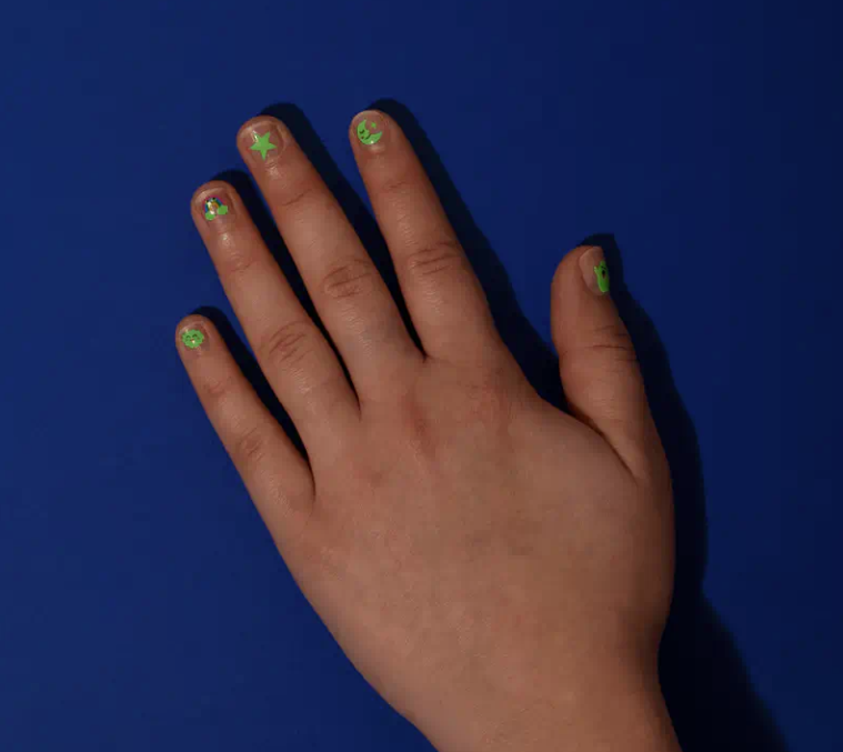 200 žavių nagų lipdukų, specialiai sukurtų vaikų nagams—paprasta užklijuoti, laikosi 1–2 dienas ir nenubyra net dažnai plaunant rankas.
