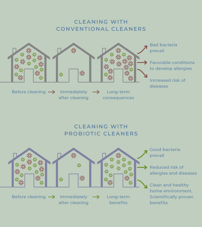 Tradicinės valymo priemonės ne tik užteršia namus agresyviomis cheminėmis medžiagomis, bet ir veikia kaip antibiotikai – jos sutrikdo jūsų namų mikrofloros pusiausvyrą, sunaikindamos ne tik blogąsias, bet ir gerąsias bakterijas. Dėl to atsiranda bakterijų disbalansas, o blogosios bakterijos ima dominuoti. Tokia namų aplinka gali būti žalinga jums ir jūsų šeimai.