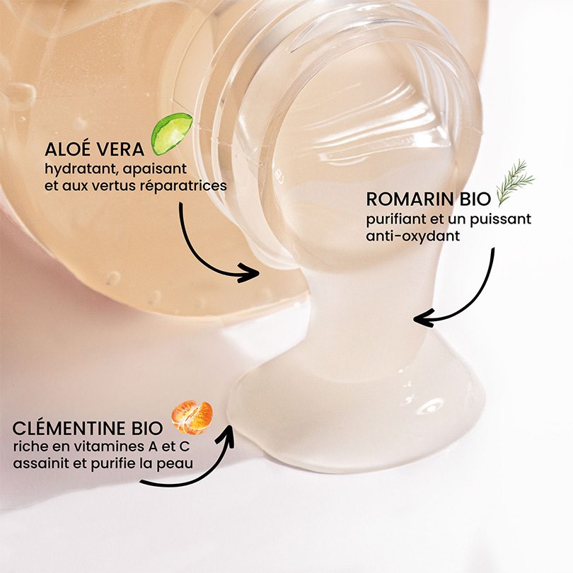 Sudedamosios dalys: Aqua (vanduo), glicerinas, Daucus Carota Sativa (morkų) sėklų ekstraktas, poligliceryl-4 caprate, Pseudotsuga Menziesii (balzaminio oregono kėnio) vanduo, Rosmarinus Officinalis (rozmarino) žiedų/ lapų/ stiebo ekstraktas, natrio citratas, ksantano derva, Citrus Paradisi (greipfruto) vaisių vanduo, Chondrus Crispus (kerageninas), gluconolaktonas, citrinų rūgštis, levulino rūgštis, benzilo alkoholis, argininas, parfumas (kvapioji medžiaga), natrio levulinatas, Aloe Barbadensis lapų sulčių milteliai, dehidroacto rūgštis, Citrus Clementina vaisių ekstraktas, natrio benzoatas, kalio sorbatas, limonenas, citralis.