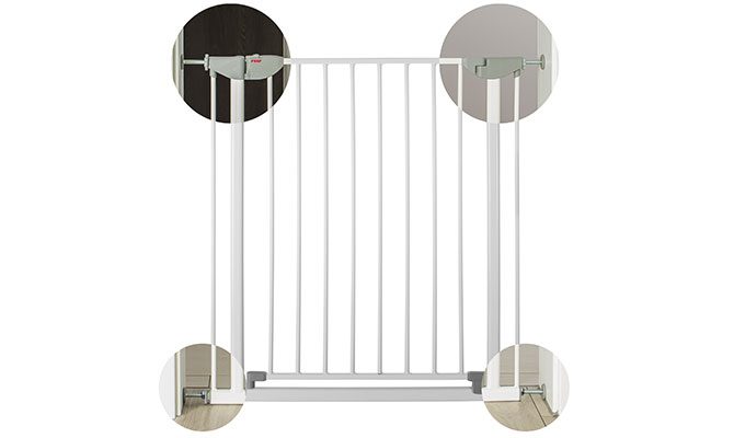 Apsauginių vartelių aukštis – 77,5 cm, juose nėra horizontalių strypų, kurie skatintų laipioti. Apvalinti kraštai ir uždari mechanizmai apsaugo vaiko pirštus nuo suspaudimo. Produktas atitinka saugos standartą EN 1930:2011 ir skirtas naudoti vaikams iki 24 mėnesių amžiaus namuose.