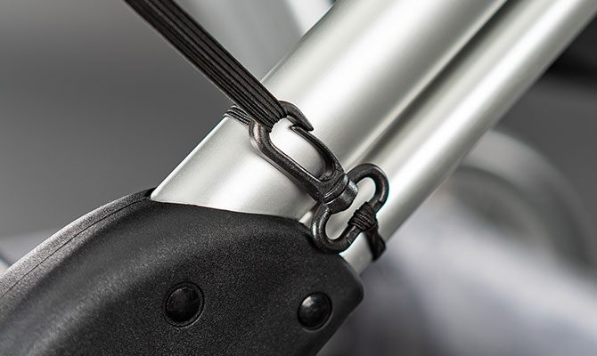 • Tvirtinimo kabliukai užtikrina tvirtą laikymą net prie vežimėlio rėmo