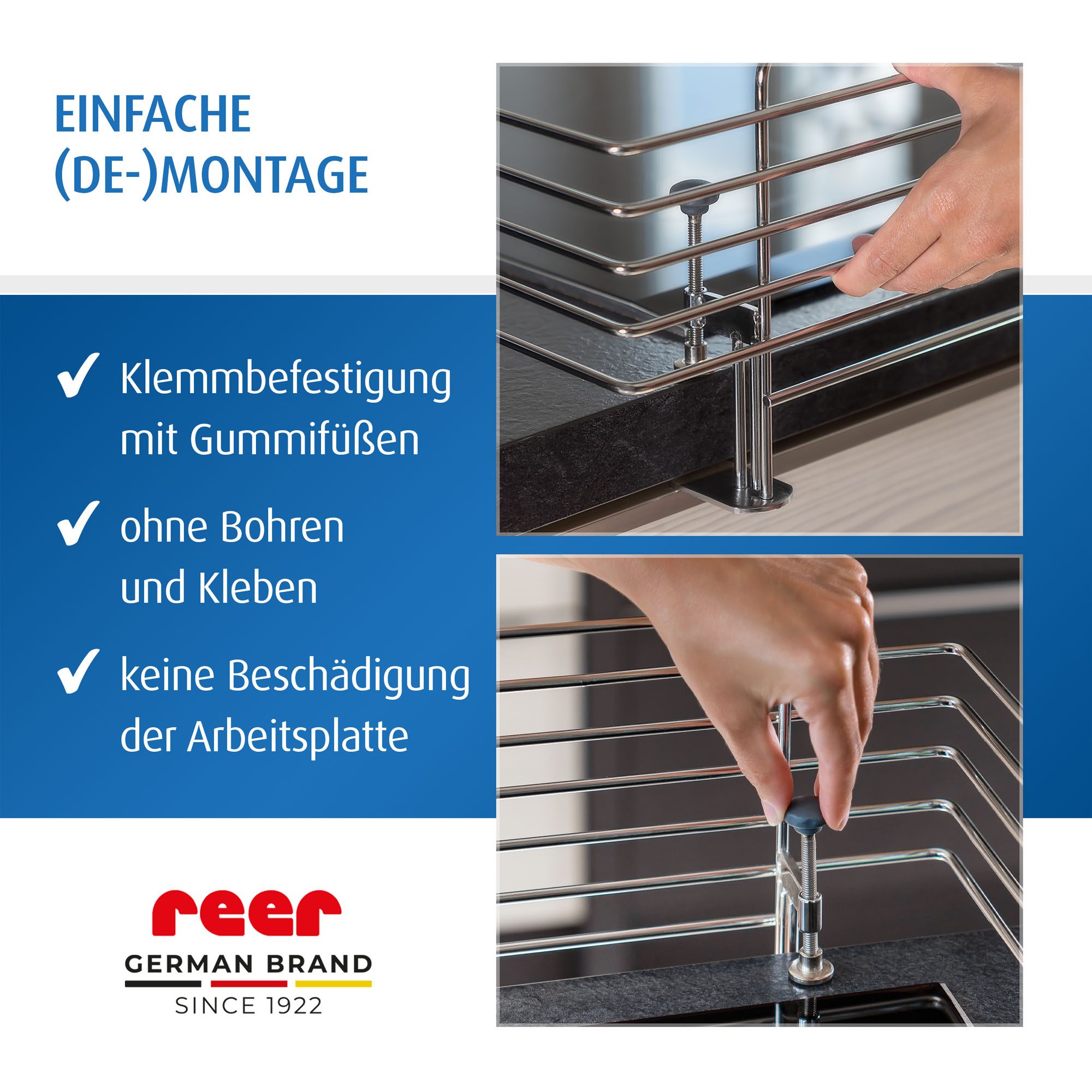 • Spaustukinė tvirtinimo sistema (nereikia gręžti ar naudoti varžtų) nežaloja stalviršio