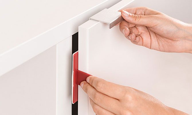 Užraktas tvirtinamas spintelės viduje, todėl baldų išoriniai paviršiai išlieka nepažeisti. Dėl specialiai sukurtos lipnios juostos užraktas lieka tvirtai savo vietoje, bet prireikus gali būti pašalintas be jokių žymių.