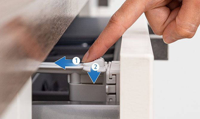 Dvigubas užrakinimo mechanizmas apsaugo spinteles nuo vaikų, tačiau suaugusieji gali atidaryti užraktą viena ranka – tereikia paspausti svirtį žemyn ir stumti į dešinę.