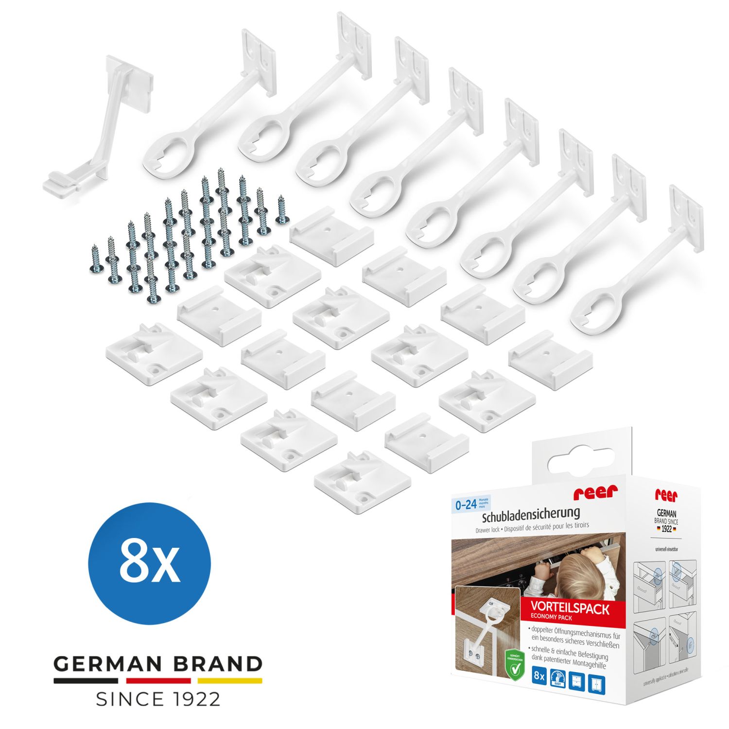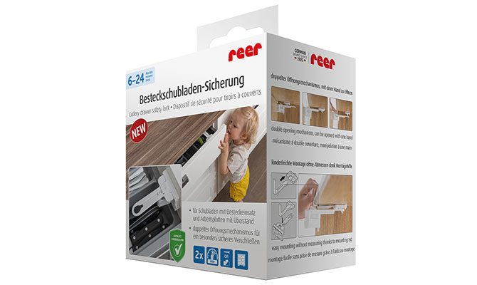 Spintelės ir stalčiai yra nepaprastai įdomūs mažiems vaikams, tačiau juose gali būti pavojingų daiktų, pavyzdžiui, peilių ar valymo priemonių. REER spintelių užrakto komplektas padeda apsaugoti vaikus nuo draudžiamų objektų ir suteikia papildomą apsaugą nuo prispaustų pirštų.