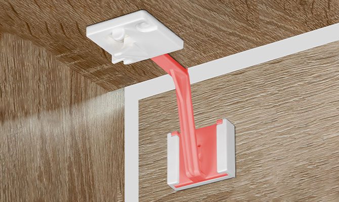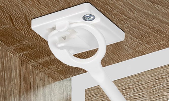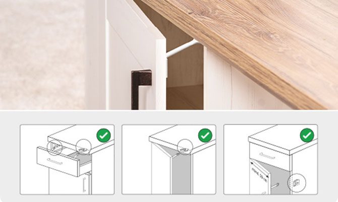 Dėka naujoviško montavimo įrankio, spyną pritvirtinti greita, paprasta ir tikslu – nereikia matuoti ar žymėti. Tiesiog pritvirtinkite montavimo dalis prie įrankio, nuimkite apsauginę plėvelę, uždėkite ant spintelės viršaus, uždarykite stalčių, palaukite akimirką, tada įrankį pakeiskite saugos užraktu ir prisukite varžtais – padaryta!