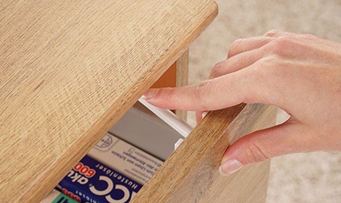 Dvigubas užrakinimo mechanizmas spinteles patikimai užrakina vaikams, tačiau suaugusiesiems spyną lengva atidaryti viena ranka – tereikia nuspausti svirtį žemyn ir pastumti į dešinę. Spyna montuojama spintelės ar stalčiaus viduje, todėl iš išorės nematoma ir dera bet kokiame interjere.