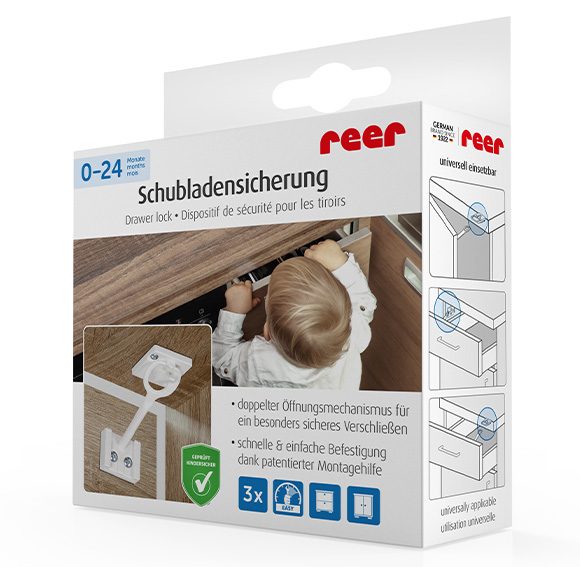 Spintelės ir stalčiai yra nepaprastai viliojantys mažiems vaikams. Kai jie mokosi ropoti ir vaikščioti, jie lengvai pasiekia daiktus, kurie neturėtų būti vaikų rankose – pavyzdžiui, aštrius įrankius ar pavojingas valymo priemones. „Reer“ vaikiška saugos spyna padeda pavojingus daiktus laikyti paslėptus, suteikdama greitą, paprastą ir patikimą apsaugą.