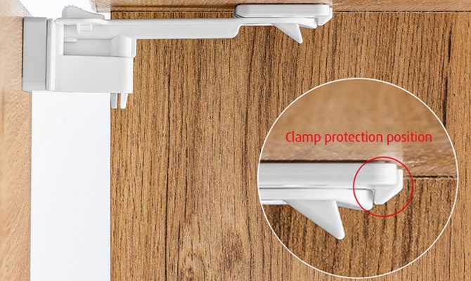 Dėl sumanaus dizaino, apsaugą galima montuoti ir po iki 20 mm išsikišančiais stalviršiais, taip pat į seklų stalčių (pvz., stalo įrankių stalčius, minimalus aukštis virš stalčiaus vidinio dėklo – 4 cm).