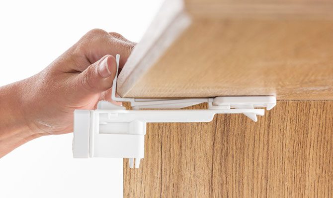 Dviguba užrakto sistema saugiai uždaro stalčius vaikams, tačiau suaugusieji gali lengvai atrakinti apsaugą viena ranka: pastumkite svirtį į priekį ir spauskite žemyn – stalčius atsiveria kaip įprasta. Apsauga montuojama stalčiaus viduje, tad lieka nematoma iš išorės ir nekeičia baldų išvaizdos.