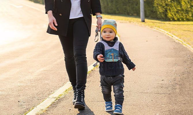 • Žingsniuojimo pavadėlis (apie 105 cm) leidžia vaikui būti saugiu atstumu, nevaržant judesių