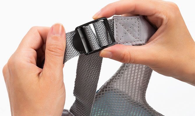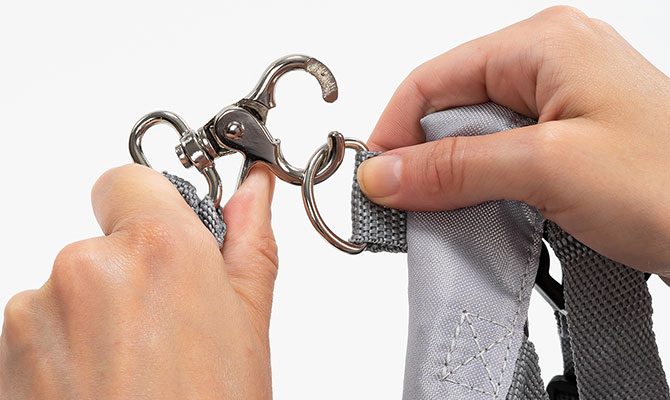 • Žingsniuojimo pavadėlį lengva prisegti ir nuimti nenuimant viso diržo