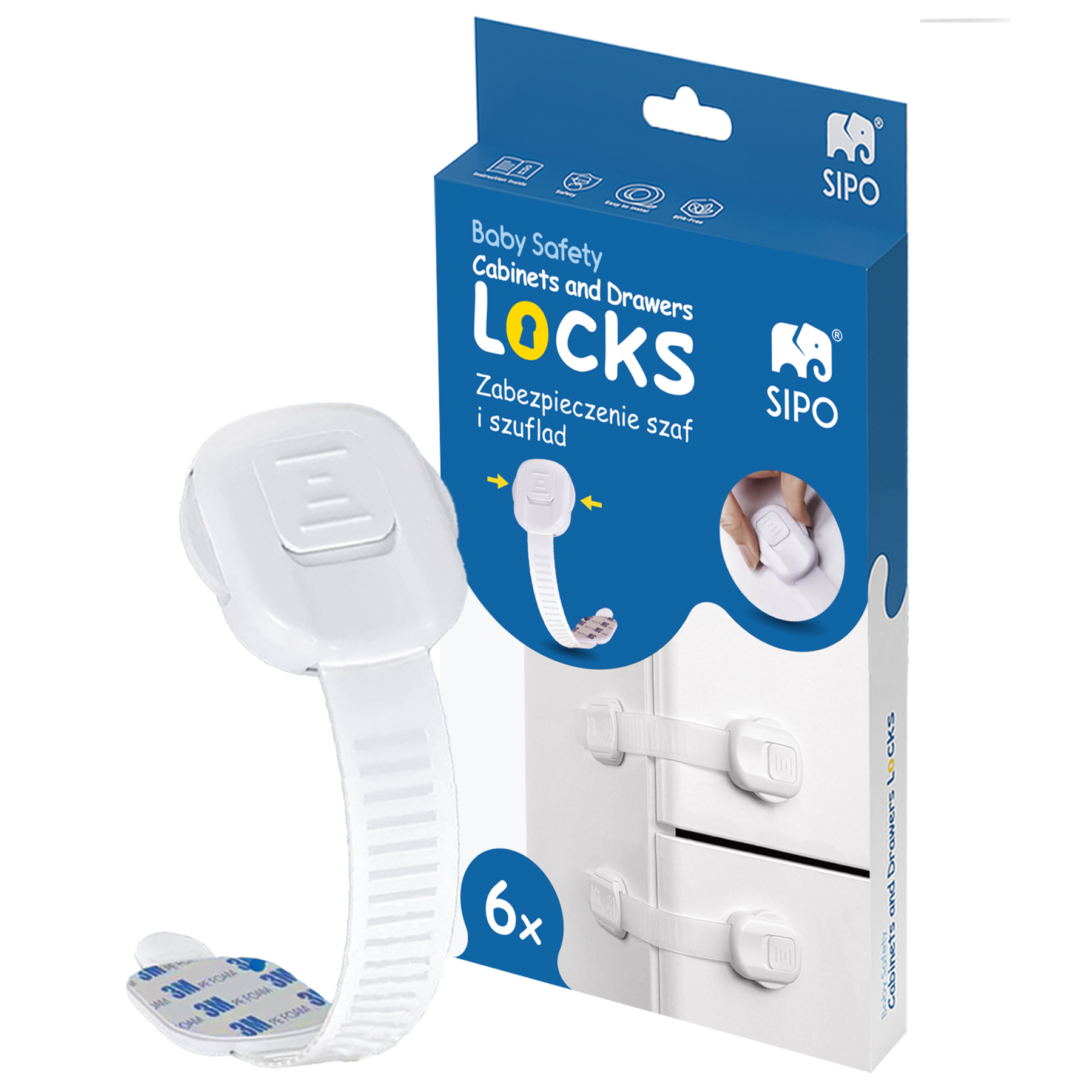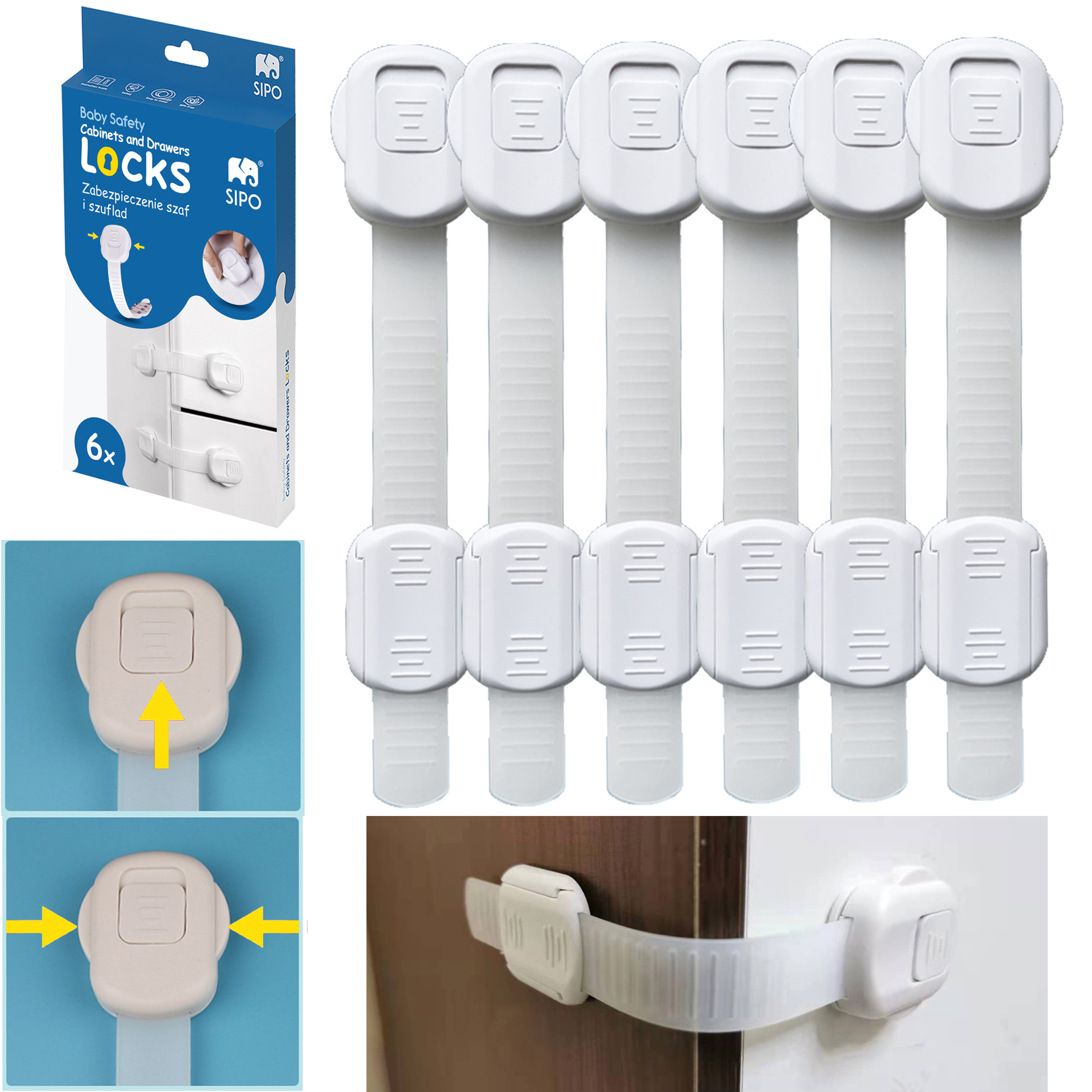 SIPO 6 dalių spintelių užraktų rinkinys su reguliuojamais užraktais, skirta spintelėms, su paprasta užrakto funkcija, kuri leidžia suaugusiems greitai pasiekti turinį, tačiau apsaugo nuo mažamečių vaikų atidarymo. Užraktai turi ilgį reguliuojamą galimybę. Tai praktiškas ir paprastas sprendimas, užtikrinantis jūsų vaiko saugumą, neleidžiantis pasiekti pavojingų daiktų ar medžiagų, laikomų spintelėse ir stalčiuose.