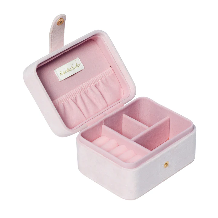 Ši magiška aksominė papuošalų dėžutė yra puiki vieta saugoti visus savo Rockahula papuošalus ir mėgstamiausius lobius! Papuošta siuvinėtu vienaragiu ir žėrinčiomis žvaigždėmis, dėžutė atsiveria ir atskleidžia tris skyrius, kišenę ir specialią vietą auskarams bei žiedams. Vidus išklotas mūsų žvaigždžių rašto audiniu.