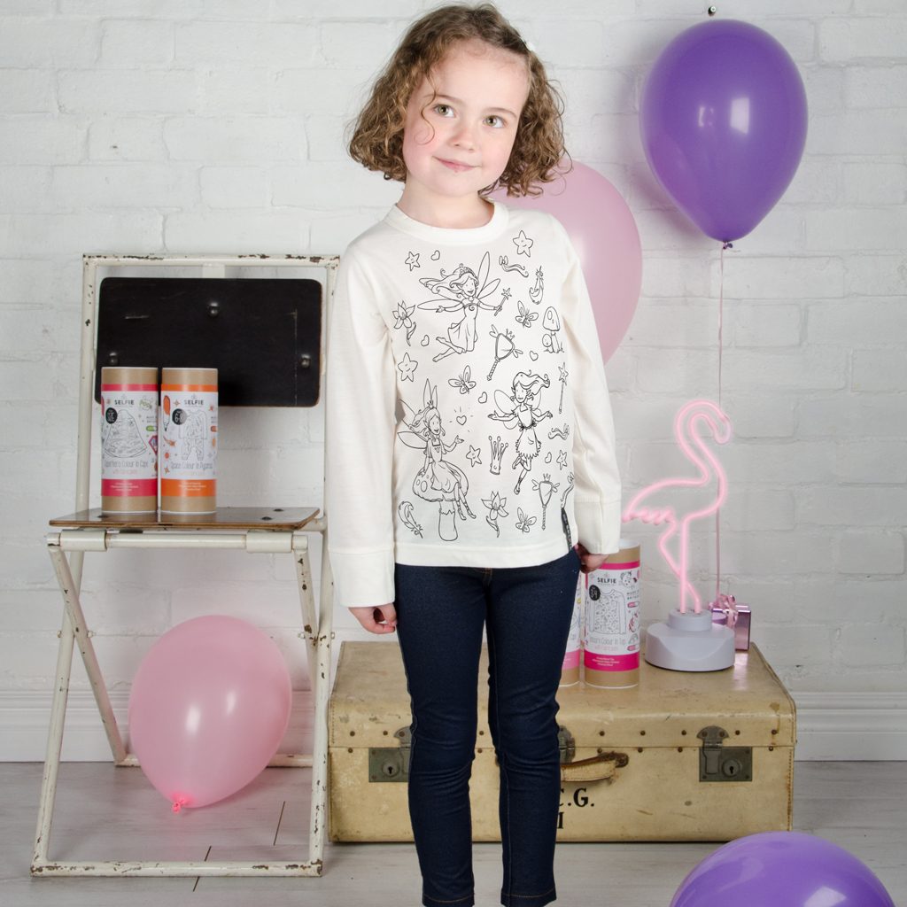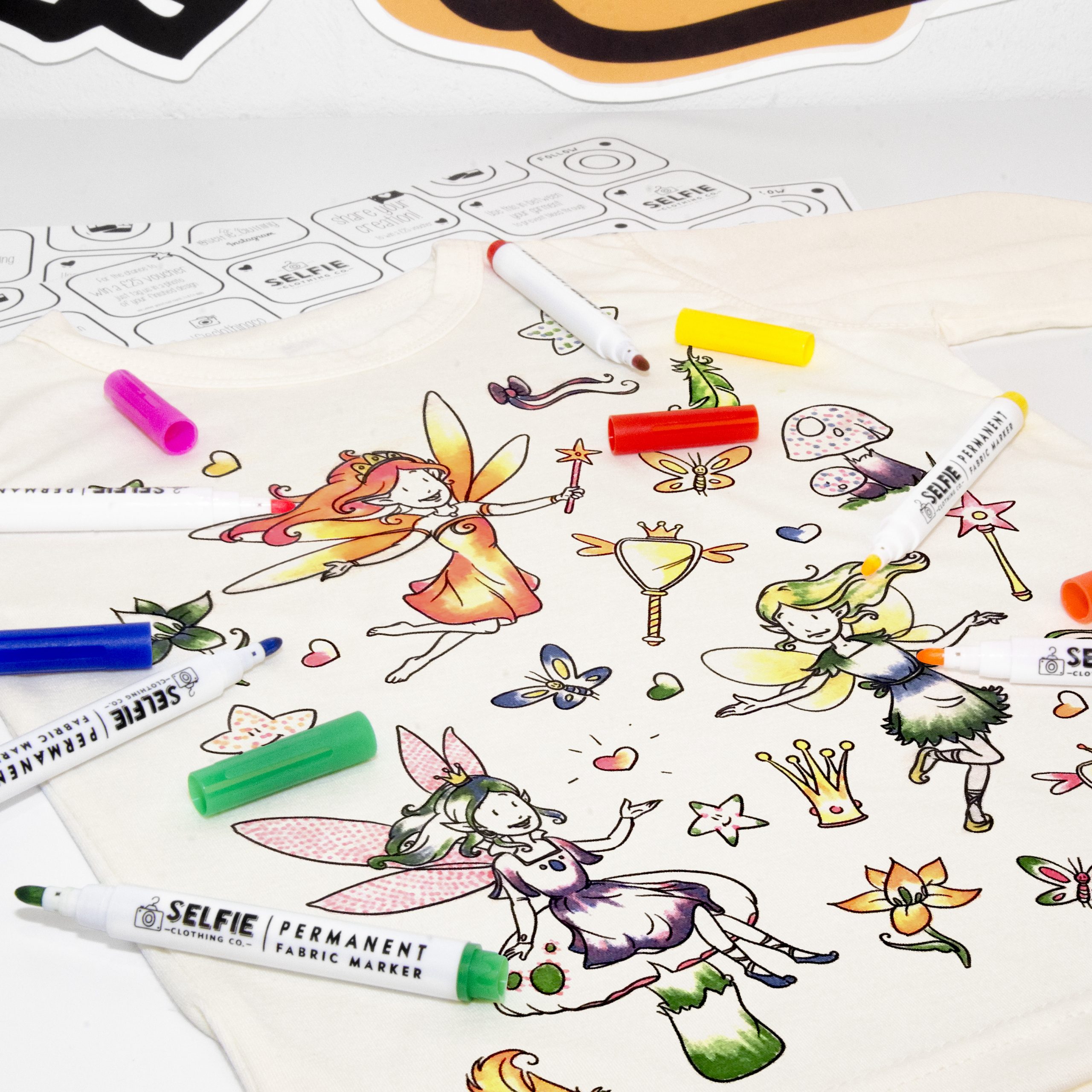 Marškinėliai pagaminti iš lengvo ir patogaus džersio audinio ir tinka 3–12 metų vaikams. Markeriai su UV rašalu, kuris išlieka ryškus net po kelių skalbimų. Spalva gali būti sutvirtinta leidžiant jai išdžiūti 24 valandas arba lyginant markeriais padengtas vietas (prižiūrint suaugusiems). Marškinėliai sukurti ir rankiniu būdu atspausdinti JK, specialiai Selfie Craft Co. Puiki dovana kūrybingam vaikui ar smagi veikla gimtadieniuose ir žaidimų pasimatymuose.